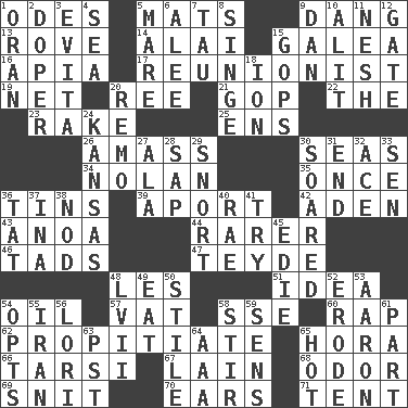 ACROSS 1. Lyric poems 5. Floor protectors 9. Mild oath, euphamism for damn 13. Be footloose 14. Mountain range southwest of Kyrgyzstan 15. An organ shaped like a helmet 16. Capital of Western Samoa 17. One who advocates reunion 19. Fish or hair follower 20. To riddle 21. Grand Old Party 22. Definite Article 23. Libertine 25. Followers of ems 26. Collect or gather 30. Oceans 34. Pitcher Ryan 35. At one time in the past 36. Canisters 39. To the left, to Queeg 42. An important port of Yemen 43. Small Philippine buffalo 44. Less widely known 46. Small amounts or degrees 47. Miss Universe 1986, Barbara Palacios _ 48. French article 51. The content of cognition 54. Petroleum 57. Large container 58. Compass dir. 60. Hit sharply and swiftly 62. Conciliate 65. Israeli folk dance 66. Tarsus (plural) 67. (Had) reclined 68. Scent 69. In a ____ (agitated or irritated) 70. Hearing organs 71. Portable shelter DOWN 1. Northwest Algerian city 2. Drug addict 3. Webber/Rice musical 4. Ocean 5. Female horse 6. Toward shelter 7. The 19th letter of the Greek alphabet 8. Burn superficially 9. One of the 12 tribes of Israel 10. Came down and settled, as after flight 11. Soft 12. Yard entry 15. Republicans 18. Electrically charged atom 20. San ____ (Riviera town) 24. Sunflower state 27. Wing 28. Plant excrement 29. Derisive sound 30. Flew 31. Conclusion 32. Adept person 33. Elected rep. 36. Make lace 37. _ tizzy (2 wds.) 38. Allow head to fall sleepily 40. Actress Charlotte 41. Attempt 45. Singer Brickell 48. 57 in ancient Rome 49. Ingest 50. Vertical member of a panel or frame 52. Wear away 53. Composer Copland 54. Elects 55. SW Asia republic 56. Australian parrot (variant) 58. Move through with a circular motion 59. Elected reps. 61. Component 63. Pacific Standard Time (abbr.) 64. Auto club (abbr.) 65. Being at a high temperature