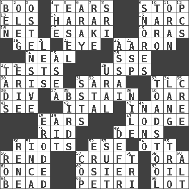 ACROSS 1. Oct. 31 cry 4. Separates forcefully 9. Halt 13. Raised railways 14. Ethiopian city, capital of Harari 15. Drug cop 16. Fish or hair follower 17. 1973 Nobel Price Winner (Physics) Leo 18. Mouths or openings 19. Set 21. Sight organ 22. Composer Copland 24. Anneal 26. Compass dir. 27. Trials 29. United States Postal Service (abbr.) 30. Ascend 31. "Two Mules for Sister ____" 33. Affectionate concern, for short 36. HTML Container Element 37. Choose not to consume 40. Boat paddle 41. Observe 42. Slanted text style (abbr.) 43. Silly 45. Hearing organs 47. Inn 48. To free from 49. Habitations of wild animals 50. Disturbances 52. Compass dir. 54. Baseball player Mel 56. Tear apart 57. An unpleasant substance 59. Mouth or opening 61. At one time in the past 62. Flexible twig of a willow tree 63. Petroleum 64. Necklace unit 65. _ dish (used to culture cells) 66. Car dealer's back yard DOWN 1. Benjamin's nick name 2. Cassini of fashion 3. Clearly or manifestly demonstrative 4. Definite Article 5. Artist's stand 6. Like ___ of sunshine 7. Libertine 8. _ Lanka 9. Sounds asleep 10. Pacific island yam 11. NW Algerian seaport 12. Personal Computers (abbr.) 20. Allows 22. Slender Brazilian palm 23. Viper 25. Toward the sea 27. Small boys 28. One of the Great Lakes 29. Mountain range 31. Fast planes 32. _ moment's notice (2 wds.) 33. Inedible or poisonous agaric 34. Long (Scottish) 35. Algonquian 38. Avian creatures 39. Mediterranean tributary 44. Words to Nanette 45. Worn away 46. Small island 49. Put off 50. French philosopher Descartes 51. South American Indian 52. Celtic language 53. Set of matching outer garments 55. Musical group of three 56. Director Reiner 57. Police officer (slang) 58. Three (prefix) 60. Keyboard modifier key