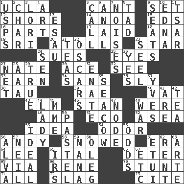 ACROSS 1. Southern CA. univ. 5. Patter 9. Arrange properly for use 12. Dinah or Pauly 14. Small Philippine buffalo 15. Begley and Asner 16. Pieces 17. Put down 18. Santa ___, CA 19. _ Lanka 20. Ringlike coral islands and reefs 23. Play the lead 24. Takes to court 25. Snake ____ (dice throw) 27. Nathan's nickname 30. Adept person 32. Perceive with the eye 33. Merit 34. Without 36. Stealthy 38. The 19th letter of the Greek alphabet 39. Actress Charlotte 40. Large container 43. Shade tree 46. Comedian Laurel of Laurel & Hardy 48. We are 49. Electrical Unit 51. Environmental prefix 52. Toward the sea 53. The main thing one is thinking about 54. Aroma 56. "60 Minutes" Commentator Rooney 58. Overwhelmed 61. Epoch 64. Area sheltered from the wind 65. Slanted text style (abbr.) 66. Prevent from occurring 68. By way of 69. French philosopher Descartes 70. Difficult or unusual or dangerous feat 71. Everything 72. Volcanic refuse 73. Quote DOWN 1. United States Postal Service (abbr.) 2. Burn to charcoal 3. Australian parrot (variant) 4. Tate display 5. Give a ring to 6. Of or related to the anus 7. Annoying sounds 8. Small boy 9. Theater features 10. Pulitzer Prize-winning author Ferber 11. Russian ruler of old 13. Son of Isaac 21. Beverages made from leaves 22. Motion picture awards 23. Sew up the eyelids of hawks and falcons 24. Elected rep. 26. It is so 27. Fish or hair follower 28. American Automobile Association (abbr.) 29. Loyal 31. Related on the mother's side 35. Manatee 37. Jacques Cousteau's middle name 41. "We ___ not amused" (Victoria) 42. Beverage made from leaves 44. Kenny Rogers chart-topper in '80 45. Madame (abbr.) 47. Thickened enlargement 48. Armed conflict 50. Soft color 53. Standard of perfection 55. Probability 56. Inventor's middle name 57. Famous astronaut Armstrong 59. Nanny 60. Cassini of fashion 61. Needle holder 62. Monthly bill 63. Johnson of "Laugh-In" 65. Big collection agency 67. And so on (abbr.)