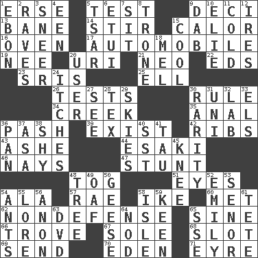 ACROSS 1. Celtic language 5. Trial 9. Tenth: prefix 13. Object of repulsion 14. Move through with a circular motion 15. Bodily heat indicating an inflammation 16. Baking chamber 17. Form of transportation 19. Born 20. RI univ. 21. Modern: prefix 22. Begley and Asner 23. Indian titles of respect 25. Pipe bend 26. Trials 30. Governing power 34. Small stream 35. Of or related to the anus 36. Romantic infatuation 39. Be 42. Teases 43. American tennis player Robert 44. 1973 Nobel Price Winner (Physics) Leo 46. Negative votes 47. Difficult or unusual or dangerous feat 48. Coat; cloak 51. Snake ____ (dice throw) 54. In the manner of 57. Actress Charlotte 58. D.D.E's nickname 60. Was introduced to 62. Unrelated to defense, as in spending 65. Trig term 66. Collection of objects 67. Not divided or shared with others 68. Slit 69. Transmit 70. Genesis locale 71. Jane of fiction DOWN 1. Inky black, to poets 2. All-night dance parties 3. Scornful expression 4. Car or cant ending 5. Russian ruler of old 6. Needle case 7. Be seated 8. Marketplace scale 9. Small moist lump or mass 10. Writer Wiesel 11. Having a low temperature 12. Angers 15. Calm and collected 18. Cartoonist voice _ Blanc 20. One who uses or employs something 24. Skin irritations 27. Perceive with the eye 28. John Ritter's dad 29. Atmospheres 30. Noteworthy scarcity 31. Single; one (prefix) 32. Experiment locale 33. Raised railways 36. Baking dish 37. White ___ sheet 38. Like a shrinking violet 40. Fast jet (abbr.) 41. The 19th letter of the Greek alphabet 45. Leg joint 48. Relationship diagram 49. Clumsy lout 50. Honkers 52. Poet Dickinson 53. Sir (Sp.) 54. Pismires 55. Old wives' tales, e.g. 56. At once, immediately (arch.) 58. Capri or Wight 59. Peachy ____! 61. Wig 63. Movie disc 64. Allow head to fall sleepily 65. Compass dir.