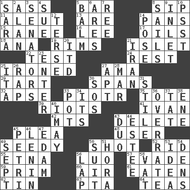 ACROSS 1. Backtalk 5. Long, evenly shaped piece 8. Small drink 11. Eskimo relative 13. "We ___ not amused" (Victoria) 14. Zero-star reviews 15. The wife of a rajah (variant) 16. Area sheltered from the wind 17. Petroleums 18. Santa ___, CA 19. Basketball hoops 21. Small island 22. Trial 24. Remainder 25. Pressed 27. Nursemaid (var.) 29. Small pie 30. Connects, as a bridge 32. Domed church section 33. Peter (Polish) 35. Haul 39. Disturbances 41. _ the terrible 42. Mountains (abbr.) 43. Keyboard key 45. Entreaty 48. One who makes use of a thing 49. Full of seeds 50. Attempt 52. To free from 55. Inactive volcano in Sicily 56. Nilotic language 57. Dodge 59. Demure 60. Wind 61. Eroded 62. Shallow baking pan 63. Parent Teacher Assoc. 64. Beverages made from leaves DOWN 1. "Two Mules for Sister ____" 2. Actor Alda or Thicke 3. Legislators 4. Take to court 5. Lip ointment 6. Ancient Greek god of war 7. Portuguese money of account (variant) 8. Moves on water 9. An arm off of a larger body of water 10. Inconspicuous attention getter 12. Laconic 14. Introduce or present, as a question 20. It would 21. SW Asia republic 23. Keyboard key 25. Call ___ day 26. Strike 27. Fitting 28. Spoil 30. Mayday 31. Vertical member of a panel or frame 33. Cooking vessel 34. ___ a Wonderful Life 36. Make much ado about nothing 37. Make lace 38. Compass dir. 40. "If ____ say so..." 43. Superhero pair 44. First name in cosmetics 45. _ dish (used to culture cells) 46. Soviet premier 1918-24 47. Dutch treat 49. Back-to-school mo. 50. Costume for a special activity 51. Israeli folk dance 53. The main thing one is thinking about 54. Lairs 56. Infant locale 58. Large container