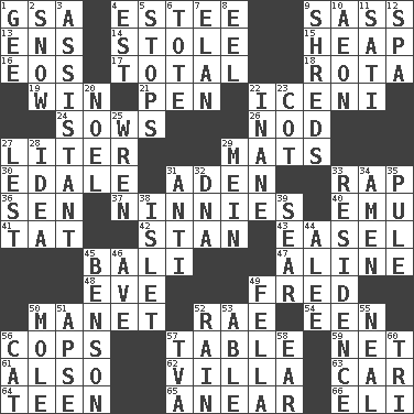 ACROSS 1. Girls' org. (abbr.) 4. First name in cosmetics 9. Backtalk 13. Followers of ems 14. Fur scarf 15. Pile 16. Greek goddess of the dawn 17. Add up to 18. Round or rotation of duties 19. Victory 21. Fenced enclosure 22. Ancient Celtic tribe of eastern Britain 24. Sty mamas 26. Dreamland 27. 61 cubic inches 29. Floor coverings 30. Peak District village in England 31. An important port of Yemen 33. Strike 36. Elected rep. 37. Simpletons 40. Australian flightless bird 41. Make lace 42. Comedian Laurel of Laurel & Hardy 43. Artist's stand 45. Indonesian resort city 47. Place in a line 48. First lady 49. Flintstone 50. French painter Edouard 52. Actress Charlotte 54. Car or cant ending 56. 911 reaches them 57. Eating place 59. Fish or hair follower 61. In addition 62. Country residence 63. Auto 64. Adolescent 65. Approach 66. Connecticut Ivy Leaguer DOWN 1. Unit of force equal to gravity 2. Overwhelm 3. Aide 4. Eastern Standard Time (abbr.) 5. Obstructs or blocks passage 6. Lug 7. Liveliness 8. Snakelike fish 9. Fragments 10. A really long time 11. Suttee (variant) 12. Health resort 20. Christmas carol 22. Empty; void 23. Small bed 25. Songbird 27. For fear that 28. It may be bright or harebrained 29. Count _ (2 wds.) 31. Opposed to 32. Heredity factor (abbr.) 33. Home 34. So be it 35. Whine 38. Small island 39. Singe 44. Toward shelter 45. Gillaume's butler role 46. "___ Maria" 49. Man or boy (slang) 50. Undercover agent 51. Domed church section 52. Precipitation 53. Competent 55. Be tempered by heat 56. Feline 57. Federal power corp. 58. Ewer handle 60. Three (prefix)