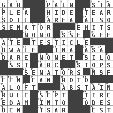 ACROSS 1. Slender fish 4. Ache 8. R.R. building 11. Entreaty 13. Flintstone garb 14. Pull into pieces 15. Earth 16. Type of rug 17. In addition 18. Legislator 21. Gives off 22. Words to Nanette 23. Compass dir. 25. Unit of force equal to gravity 26. Had dinner 29. A testis 32. A sleeping potion; an opiate (poet.) 34. _ tizzy (2 wds.) 35. White ___ sheet 38. Have the gumption 39. Music written for nine 41. Grain storage tower 43. Fast jet (abbr.) 44. Curve 45. Discontinues 46. Legislators 50. Overdraft (abbr.) 51. Car or cant ending 54. Avid follower 55. Printing process, for short 57. High up in or into the air 59. Choose not to consume 63. General guideline 64. Back-to-school mo. 67. Hoop that covers a wheel 68. Dutch treat 69. To the inside or interior of 70. Lyric poems 71. Lair 72. Russian ruler of old 73. Eastern Standard Time (abbr.) DOWN 1. Global Positioning Systems (abbr.) 2. _ vera 3. It's straight from the horse's mouth 4. N Egypt peninsula 5. Atmosphere 6. Binary compound 7. Teachers' org. 8. Former Milwaukee Brewers owner Bud 9. Clothes sense 10. Came up 12. Actor Alda or Thicke 14. Scottish cap 19. Lug 20. Single 21. Snakelike fish 23. Trig term 24. Get outta here! 26. Say or write further 27. It was, poetically 28. Hearing organs 30. Colored lightly or faintly 31. Compass direction 33. Allows 36. The Jewish people; Israel 37. High mountains 39. Grandmother 40. Northwest Algerian city 42. Order of Saint Francis (abbr.) 45. Fast planes 47. Newt 48. Speaker 49. Director Reiner 51. Having ears or earlike features 52. Evade 53. Pitcher Ryan 56. Von Bismarck 58. Opposite of masc. 60. Assistant 61. Angers 62. A home for chicks 64. Be seated 65. Followers of ems 66. Parent Teacher Assoc.