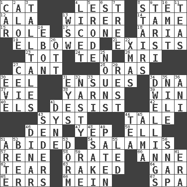 ACROSS 1. Domesticated feline 4. For fear that 8. Proofreading order 12. Wing 13. One who wires 14. Docile 15. Hero or heavy, e.g. 17. Biscuitlike quick bread 18. Roberta Peters solo 19. Turned at an angle; bent 21. Is extant 23. Small child 24. Nine, plus one 26. Medical imaging device (abbr.) 27. Patter 28. Mouths or openings 30. Snakelike fish 31. Follows as a consequence or result 34. Heredity factor (abbr.) 37. Compete 38. Tall tales 39. Victory 40. Raised railways 41. Stop 42. Biblical high priest 43. System (abbr.) 44. Falsehood 46. Lair 47. Slangy assent 50. Pipe bend 51. Remained 54. Deli grouping 57. French philosopher Descartes 58. Speak pompously 60. Singer Murray 62. Separate forcefully 63. Moved through 64. Slender fish 65. Blunders 66. Chow _ 67. Health resort DOWN 1. Automobile 2. _ vera 3. Baron Munchausen's specialties 4. It is permitted: Lat. 5. Wear away 6. Elected rep. 7. Relationship diagram 8. Flight of steps 9. Tarsus (plural) 10. Give off 11. Beverages made from leaves 13. Compass dir. 16. Inky black, to poets 20. Baseball player Mel 22. Dec. holiday 25. Parts of speech 27. To provide with a ceiling 29. Relief 30. Night before a holiday 31. Snake ____ (dice throw) 32. Offensive 33. Indian title of respect (Mr.) 34. Homes 35. Mediterranean tributary 36. Black tropical American cuckoo 41. Unit of force 43. Spring feasts 44. Beverage made from leaves 45. _ mater 46. Middle Eastern gold or silver currency 48. 1973 Nobel Price Winner (Physics) Leo 49. Eucharist need 51. Johnson of "Laugh-In" 52. Fermented drink made from hops 53. Dormintory (informal) 55. Directed 56. Fastener 59. Actress Charlotte 61. Period