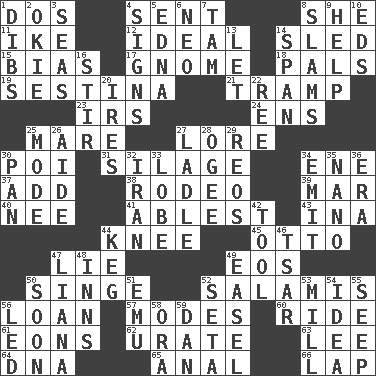 ACROSS 1. Two (Sp.) 4. Posted 8. A female animal or person 11. D.D.E's nickname 12. Standard of perfection 14. Downhill vehicle 15. Prejudice 17. Dwarf 18. Friends 19. French poetic form 21. _____ steamer (cargo ship) 23. Big collection agency 24. Followers of ems 25. Female horse 27. Old wives' tales, e.g. 30. Luau course 31. Fodder prepared in a silo 34. Compass dir. 37. Say or write further 38. Cowboy competition 39. Spoil 40. Born 41. Most capable 43. _ tizzy (2 wds.) 44. Leg joint 45. "Beetle Bailey" pooch 47. Whopper 49. Greek goddess of the dawn 50. Scorch 52. Deli grouping 56. Grant temporary use of 57. Methods 60. Travel on or in a vehicle 61. Immeasurably long periods of time 62. A salt of uric acid 63. Area sheltered from the wind 64. Heredity factor (abbr.) 65. Of or related to the anus 66. Infant locale DOWN 1. Claim 2. Migrant worker of the '30s 3. Oceans 4. Public displays of written messages 5. Pulitzer Prize-winning author Ferber 6. Modern: prefix 7. Scottish cap 8. Shuts with force 9. Aid 10. Begley and Asner 13. Allow 14. Connect, as a bridge 16. Use a swizzle stick 20. Angers 22. Portuguese money of account (variant) 25. Method 26. Helper 27. Dipping utensil 28. Double curve, resembling the letter S 29. Vintage cars 30. Baking dish 32. SW Asia republic 33. Ear part 34. Send forth 35. Billionth: prefix 36. Period 42. Instrument 44. Cask 46. Russian ruler of old 47. Woody, climbing, usually tropical plant 48. Lodging establishments 49. Artist's stand 50. Within a short period 51. Australian flightless bird 52. Stalk of a moss capsule 53. Place where flour is made 54. The content of cognition 55. Ooze 56. Directed 58. Mouth or opening 59. Daniel's nick name
