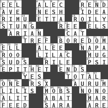 ACROSS 1. Snakelike fish 4. Actor Baldwin 8. Tear apart 12. "___ Maria" 13. Tender 14. The content of cognition 15. Tall New Zealand timber tree 17. Singer James 18. Turbulent 19. Feeling sharp psychological pain 21. To sift 23. Raised railways 24. Believer in; advocate of (suffix) 26. Domesticated feline 28. Not kosher 30. Mood resulting from idleness 34. Pipe bend 37. Toward shelter 39. California wine valley 40. Friend of Pooh 41. Pale purple color 43. Large cup 44. Beer foam 46. Cause heat under the collar 47. Air pressure measure (abbr.) 48. Curse 51. Extremities 54. Affirmative reply 55. Add up to 58. Single 61. Acura sports coupe 63. Gold (Symbol: Au) 65. Ms. Damita and namesakes 67. Crowds into 71. Words to Nanette 72. Came down and settled, as after flight 73. Blind as ____ 74. Third mo. 75. Nourish 76. "Two Mules for Sister ____" 77. "We ___ not amused" (Victoria) DOWN 1. Hearing organs 2. Webber/Rice musical 3. Arboreal primate 4. A saturated hydrocarbon 5. Allow 6. Eastern Standard Time (abbr.) 7. Burn to charcoal 8. River (Sp.) 9. Singer Brickell 10. 1994 drama film starring Jodie Foster 11. 24-hour periods 16. A single undivided whole 18. Posterior 20. Slender fish 22. Environmental prefix 25. Be tempered by heat 27. "___ Little Indians" 29. Talk or behave amorously 30. Calif. Air Force Base 31. Moist 32. Musical composition 33. Wise men 34. Celtic language 35. Central Nebraska county 36. Farming town in central California 38. Biblical high priest 42. Penny 45. Filthy place 49. Possessive pronoun 50. Curvy letter 52. ___ good deed 53. Surprise greatly 56. Scent 57. Type of eclipse 58. Norwegian king 59. The longest river in the world 60. Writer Wiesel 62. Dec. holiday 64. Greater amount 66. It would 68. Chief or king in Benin or Nigeria 69. Drinking establishment 70. R.R. building