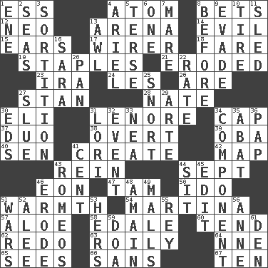 ACROSS 1. Double-curved letter 4. Tiny particle 8. Antes 12. Modern: prefix 13. Sports stadium 14. Tending to cause great harm 15. Hearing organs 17. One who wires 18. Conductor's collection 19. Paper fasteners 21. Worn away 23. Lyricist Gershwin 24. French article 26. "We ___ not amused" (Victoria) 27. Comedian Laurel of Laurel & Hardy 28. Nathan's nickname 30. Connecticut Ivy Leaguer 31. Poe poem 34. Head covering 37. Superhero pair 38. Unconcealed 39. Chief or king in Benin or Nigeria 40. Elected rep. 41. Make 42. Atlas unit 43. It's straight from the horse's mouth 44. Back-to-school mo. 46. A really long time 47. Scottish cap 50. Wedding promise 51. Heat 54. Chrissie's court nemesis 57. _ vera 58. Peak District village in England 60. Be inclined (to) 62. Make new 63. Agitated, as a liquid 64. Compass dir. 65. Perceives with the eye 66. Without 67. Nine, plus one DOWN 1. Compass dir. 2. Oceans 3. Casting lots 4. Satellite of Uranus 5. Laconic 6. Single 7. Female horse 8. Prior to 9. Dodge 10. Hoop that covers a wheel 11. Downhill vehicle 13. Leather borer 16. "Two Mules for Sister ____" 20. Baking dish 22. Pace 25. Derisive sound 27. Change direction abruptly 29. Johnson of "Laugh-In" 30. Begley and Asner 31. Australian parrot (variant) 32. Happening 33. Teachers' org. 34. Part 35. Blind as ____ 36. Infant food 41. Penny 43. Lover boys 44. Be seated 45. Prepare for publication 46. Eat (away) 48. At full speed 49. Shopping centers 51. Armed conflicts 52. Toward shelter 53. Possessive pronoun 55. Marina Del _, California 56. Singer Murray 59. ___ good deed 61. Lair