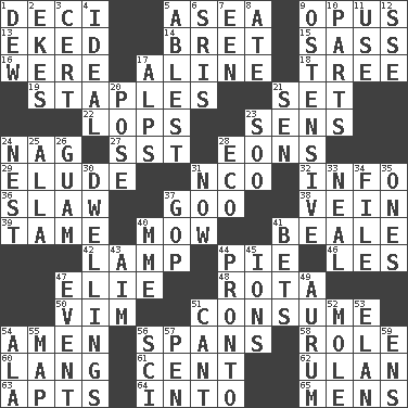 ACROSS 1. Tenth: prefix 5. Toward the sea 9. Musical composition 13. Made supply last 14. Cy Young winner Saberhagen 15. Backtalk 16. We are 17. Place in a line 18. Woody plant 19. Paper fasteners 21. Arrange properly for use 22. Chops off 23. Elected reps. 24. Tired old horse 27. Fast jet (abbr.) 28. Immeasurably long periods of time 29. Dodge 31. Non-commissioned officer (abbr.) 32. A message received and understood 36. Cole _ (cabbage dish) 37. Thick or sticky substance 38. Distinctive style or manner 39. Not wild 40. Cut the grass 41. Calif. Air Force Base 42. Desk light 44. Sliced dessert 46. French article 47. Writer Wiesel 48. Round or rotation of duties 50. Zeal 51. Ingest 54. So be it 56. Connects, as a bridge 58. Hero or heavy, e.g. 60. Austrian-born American filmmaker Fritz 61. Penny 62. ____ Bator, Mongolia 63. Tenement units (abbr.) 64. To the inside or interior of 65. Not women's DOWN 1. Morning condensation 2. Makes supply last 3. Sure thing 4. Standard of perfection 5. Most capable 6. Indian titles of respect 7. Car or cant ending 8. Had dinner 9. Clearly or manifestly demonstrative 10. Actors' quests 11. Purpose 12. Compass dir. 17. High mountains 20. Airs 21. Elected rep. 23. "Barney Miller" actor Jack 24. Egg locale 25. Silent film actress Nazimova 26. Island territory of the United States 28. Environmental prefix 30. Residences 31. Immediately 33. Be tempered by heat 34. Do some clerical work 35. Washington bills 37. Republican Party 40. Madame (abbr.) 41. Stakes 43. Direct toward a target or goal 44. Right away 45. Charged atoms 47. Happening 49. Gold (Symbol: Au) 51. Patter 52. Undercover agent 53. Style 54. According to 55. Atlas unit 56. _-fi 57. Fenced enclosure 59. Followers of ems