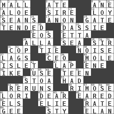 ACROSS 1. Shopping center 5. Had dinner 8. One (Scot) 11. Medicinal plant 12. Male parent of an animal 14. Myrna of the movies 15. Actors Connery and Penn 17. Soon (poet.) 18. Yard entry 19. Watched over 21. Hyrax 23. Greek goddess of the dawn 25. Singer James 26. Silent film actress Nazimova 27. Ocean 28. Title for a knight 31. Police officer (slang) 33. Standoff 35. Annoying sound 37. Straggles 38. Corporate head (abbr.) 40. Undercover agent 41. Small island 43. Infant locale 45. Compass dir. 46. Eisenhower's nickname 47. Purpose 50. Adolescent 52. Portico 53. Possessed 54. Summer TV shows 56. Full of chinks, cracks, or crevices 61. Australian parrot (variant) 62. Letter starter 65. Having ears or earlike features 66. Raised railways 67. Writer Wiesel 68. Pace 69. Turn to the right 70. Filthy place 71. Enthusiasm DOWN 1. Vertical spar for supporting sails 2. Toward shelter 3. Grant temporary use of 4. Grant temporary use of 5. White ___ sheet 6. Shallow baking pan 7. Eats (away) 8. Mountain range southwest of Kyrgyzstan 9. Observe 10. Sight organ 13. Maternal 16. Sew up the eyelids of hawks and falcons 18. Girls' org. (abbr.) 20. Dunce 22. Comedian Laurel of Laurel & Hardy 24. Ketch in the Levant 26. Domed church section 28. The Jewish people; Israel 29. Small island 30. To separate or throw off 31. Keg 32. Stare 34. Snakelike fish 36. Sign of things to come 37. Cards in a Roman deck? 39. Pledge 42. Ballerina skirt 44. Lightbulb-shaped fruit 48. Something which is sent 49. Artist's stands 51. Singer Brickell 52. Indian title of respect (Mr.) 54. Hero or heavy, e.g. 55. Celtic language 57. Female horse 58. Taken by mouth 59. Bristle 60. Locale of original sin 61. Part of a journey 63. Small island 64. Marina Del _, California