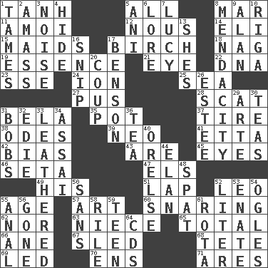 ACROSS 1. Hyperbolic tangent 5. Everything 8. Make imperfect 11. Mine, in Marseilles 12. Common sense 14. Connecticut Ivy Leaguer 15. Women servants 17. A tree used for making furniture 18. Tired old horse 19. Substance 21. Sight organ 22. Heredity factor (abbr.) 23. Compass dir. 24. Electrically charged atom 25. Ocean 27. Product of festering 28. Leave at once 31. Actor Lugosi 35. Plant holder 37. Hoop that covers a wheel 38. Lyric poems 39. Modern: prefix 41. Singer James 42. Prejudice 43. "We ___ not amused" (Victoria) 45. Sight organs 46. Bristle 47. Raised railways 49. Part of HMS, perhaps 51. Pet locale 52. Lion 55. Grow older 57. Nonscientific branch of learning 60. Catching in a trap 62. And not 63. Sibling's daughter 65. Add up to 66. A saturated hydrocarbon 67. Downhill vehicle 68. Wig 69. Directed 70. Followers of ems 71. Ancient Greek god of war DOWN 1. Domesticates 2. Collect or gather 3. Annoying sound 4. Flintstone garb 5. Cuckoo 6. Old wives' tales, e.g. 7. "I Love _" 8. Ananias' fault 9. Actor Alda or Thicke 10. Port city in Latvia 13. "______ My Girl" (Turtles hit) 16. Sever or remove by pinching or nipping 17. Gillaume's butler role 20. Overturn; upset 26. First name in cosmetics 29. Johnson of "Laugh-In" 30. Beverages made from leaves 31. Moves up and down 32. Singer Brickell 33. Tough but pliablecoriaceous 34. Slender Brazilian palm 36. Afternoon social gathering 40. Threatening words 44. Enthusiasm 48. Argument over a trivial matter 50. Without 52. 61 cubic inches 53. Related on the mother's side 54. Stares 55. Of or related to the anus 56. Went 58. Cause heat under the collar 59. Adolescent 61. Round or rotation of duties 64. Music discs