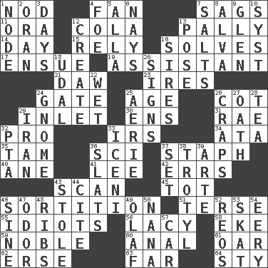 ACROSS 1. Dreamland 4. Air blower 7. Sinks 11. Mouth or opening 12. Root beer relative 13. Friendly 14. 24 hours 15. Trust 16. Finds the solution 17. Take place subsequently 19. Aide 21. Obsolete 23. Angers 24. Yard entry 25. Ripen 26. Small bed 29. An arm off of a larger body of water 30. Followers of ems 31. Actress Charlotte 32. Adept person 33. Big collection agency 34. "One Day ___ Time" 35. Scottish cap 36. _-fi 37. Staphylococcus 40. One (Scot) 41. Area sheltered from the wind 42. Blunders 43. Skim 45. Small child 46. Decision 51. Laconic 55. Foolish or stupid persons 56. Made of lace 58. Make supply last 59. Impressive in appearance 60. Of or related to the anus 61. Boat paddle 62. Celtic language 63. Distant 64. Filthy place DOWN 1. Connecting point 2. Northwest Algerian city 3. 24-hour periods 4. Enemy 5. Silent film actress Nazimova 6. Negative votes 7. Table seasonings 8. Inventor's middle name 9. Small, secluded valley 10. System (abbr.) 12. Make 13. Introduce or present, as a question 16. Begets 18. Freehold land 20. Public displays of written messages 22. Soggy 24. Dwarf 25. Nest on high 26. Dice game 27. Pledge 28. Beverage made from leaves 29. SW Asia republic 32. Parent Teacher Association (abbr.) 33. Ancient Celtic tribe of eastern Britain 36. Narrow boards 37. Put into a specified state 38. Trinitrotoluene 39. Johnson of "Laugh-In" 43. Fur scarf 44. Quote 46. Trig term 47. Aroma 48. Chest bones 49. Norwegian king 50. Grandmother 52. Vintage cars 53. Three-handed card game 54. Suggestive of the supernatural 57. Auto