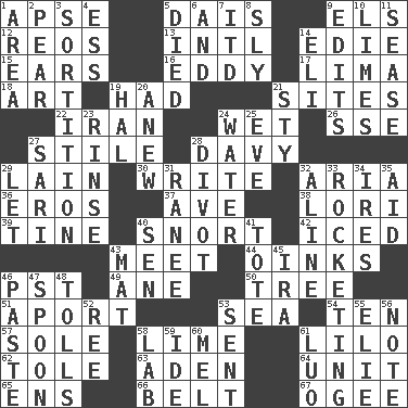 ACROSS 1. Domed church section 5. Raised platform 9. Raised railways 12. Vintage cars 13. International (abbr.) 14. Singer Brickell 15. Hearing organs 16. Whirlpool 17. Pale green bean 18. Tate display 19. Possessed 21. Settings 22. SW Asia republic 24. Soggy 26. Compass dir. 27. Vertical member of a panel or frame 28. _ Jones' Locker 29. (Had) reclined 30. Compose 32. Roberta Peters solo 36. Greek god of love 37. "___ Maria" 38. Australian parrot (variant) 39. Prong on a fork 40. Derisive sound 42. On the rocks 43. Rendezvous 44. Pig sounds 46. Pacific Standard Time (abbr.) 49. A saturated hydrocarbon 50. Family _ (genealogy) 51. To the left, to Queeg 53. Ocean 54. Nine, plus one 57. Not divided or shared with others 58. Citrus frut 61. _ and Stitch 62. Lacquered or enameled metalware 63. An important port of Yemen 64. A single undivided whole 65. Followers of ems 66. Waist strap 67. Double curve, resembling the letter S DOWN 1. Length times width 2. Lightbulb-shaped fruit 3. Casting lots 4. Curvy letter 5. Passed on 6. Added to 7. It would 8. Roguish 9. Proofreads 10. Citrus fruits 11. Gospel singer Marvin 14. Connecticut Ivy Leaguer 19. Actor Linden 20. Afresh 21. Filthy place 23. Remove soap 24. Wetness 25. Night before a holiday 27. Indian skirt 28. A piece of turf (Scot.) 29. Allow 31. The wife of a rajah (variant) 32. Place in a line 33. Shooting up abruptly 34. Angers 35. Assist 40. Elected rep. 41. Carry 43. Floor protector 45. Retirement account (abbr.) 46. Thick mixture 47. Soup utensil 48. For Whom the Bell _____ 52. To sift 53. Transmitted 55. Writer Wiesel 56. Musical sound 58. Experiment locale 59. Binary compound 60. Cartoonist voice _ Blanc 61. Nilotic language