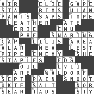 ACROSS 1. Atmosphere 4. Writer Wiesel 8. Yawn 12. R.R. building 13. Basketball hoops 14. ____ Bator 15. Leg coverings 18. Plant excrements 19. Drink excessively 20. Cordwainer's material 22. Had dinner 23. One of the Great Lakes 24. Australian flightless bird 25. Before (prefix) 26. Catching in a trap 30. Head covering 33. Ms. Damita and namesakes 36. Length times width 37. Having or resembling wings 39. Teachers' org. 40. For fear that 41. Corncob 42. Foe 44. A female animal or person 45. Paper fasteners 47. Begley and Asner 50. Lubricate 51. 57 in ancient Rome 53. "We ___ not amused" (Victoria) 54. Apple salad 57. Back-to-school mo. 59. Ache 61. Snout, nose 63. Migrant worker of the '30s 64. Table seasoning 65. Not either 66. Burn superficially 67. Bits 68. Filthy place DOWN 1. Cleo's killer 2. Slanted text style (abbr.) 3. The wife of a rajah (variant) 4. Celtic language 5. One who doesn't tell the truth 6. Naughty child 7. Curvy letter 8. From the throat 9. _ vera 10. Infant food 11. Compass dir. 16. Canvas cover 17. Agitate 21. The bottom of a shoe or boot 22. Wet nurse (var.) 24. Followers of ems 26. Thailand, formerly 27. Angers 28. Delicate 29. Yard entry 30. Balmoral and tarboosh 31. Set down 32. Dad 34. Restaurants 35. Area sheltered from the wind 38. Newsperson 42. Snakelike fish 43. Shout 46. Untruth 48. Movie discs 49. The Jewish people; Israel 52. Metal shackles 53. Capital of Western Samoa 54. Rampant 55. Pismires 56. Pick up the tab 57. Mayday 58. Make supply last 59. Pacific Standard Time (abbr.) 60. Auto club (abbr.) 62. Attempt to accomplish something