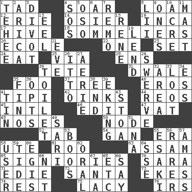 ACROSS 1. Small boy 4. Fly high 8. Rich soil 12. One of the Great Lakes 14. Flexible twig of a willow tree 16. South American Indian 17. Hub of activity 18. Wine waiters 20. Learning spot: Fr. 22. Single 23. Arrange properly for use 24. Consume 25. By way of 28. Followers of ems 30. False hair 31. A sleeping potion; an opiate (poet.) 35. Egg _ yung 37. Family _ (genealogy) 40. Greek god of love 41. Native american tent (variation) 42. Pig sounds 44. Vintage cars 45. International (abbr.) 46. Prepare for publication 47. Large container 48. Olfactory organs 50. Thickened enlargement 52. Bar bill 54. Separate the seeds from cotton 55. Period 58. Shoshoni 61. Friend of Pooh 63. Indian state 65. Seigniories (variant) 70. "Two Mules for Sister ____" 71. Singer Brickell 72. Before Barbara or Clara 73. Makes supply last 74. State of inaction 75. Made of lace 76. Big collection agency DOWN 1. Giggle 2. N. Chile seaport 3. A piece of turf (Scot.) 4. Distress signal 5. Bear (Spanish) 6. Direct toward a target or goal 7. San ____ (Riviera town) 8. Cards in a Roman deck? 9. Washington bills 10. Measure of real estate 11. Vertical spar for supporting sails 13. Snakelike fish 15. French philosopher Descartes 19. Grant temporary use of 21. Night before a holiday 26. "Tell ____ the Marines!" 27. Nest on high 29. Turn aside suddenly 30. Rest room 32. Length times width 33. Spoils 34. Curvy letter 35. Fine (Spanish) 36. Elects 38. Conclusion 39. Supplementing with great effort 41. Metal container 43. Portico 49. Indian skirt 51. Heredity factor (abbr.) 53. Scornful sounds 55. 1973 Nobel Price Winner (Physics) Leo 56. More uncommon 57. Collect or gather 58. One who uses or employs something 59. Periodic rise and fall of the sea level 60. Armor plate that protects the chest 62. Relating to the mouth 64. Compass dir. 66. Remaining after all deductions 67. _ tizzy (2 wds.) 68. And so on (abbr.) 69. Declare