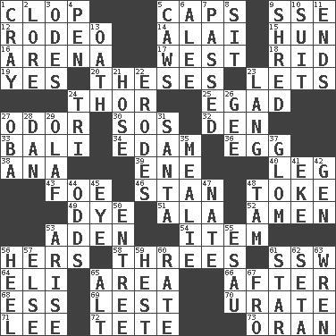 ACROSS 1. Hoof sound 5. Smile enhancers 9. Compass dir. 12. Cowboy competition 14. Mountain range southwest of Kyrgyzstan 15. Attila the _ 16. Sports stadium 17. Compass direction 18. To free from 19. Consenting reply 20. College papers 23. Allows 24. Son of Odin 25. Mild oath 27. Scent 30. Mayday 32. Lair 33. Indonesian resort city 34. Dutch treat 36. Ovum 38. Santa ___, CA 39. Compass dir. 40. Part of a journey 43. Enemy 46. Comedian Laurel of Laurel & Hardy 48. Puff or smoke 49. Color 51. Wing 52. So be it 53. An important port of Yemen 54. Detail 56. Possessive pronoun 58. Triplets 61. Compass dir. 64. Connecticut Ivy Leaguer 65. Length times width 66. Following 68. Curvy letter 69. For fear that 70. A salt of uric acid 71. Area sheltered from the wind 72. False hair 73. Northwest Algerian city DOWN 1. Supercomputer manufacturer 2. Old wives' tales, e.g. 3. Lyric poems 4. Writing instrument 5. Crow sounds 6. Toward shelter 7. Went by 8. Be seated 9. Fragment 10. Set of matching outer garments 11. Extremities 13. Pledge 21. Stockings 22. Eats (away) 23. Long (Scottish) 24. Three (prefix) 26. Unit of force equal to gravity 27. Chief or king in Benin or Nigeria 28. Daniel's nick name 29. Norwegian king 31. Before Barbara or Clara 35. Ear of corn 37. Take by theft 41. Supplement with great effort 42. Commissioned mil. rank 44. Probability 45. Sight organ 47. Nathan's nickname 48. Scottish cap 50. Main course 53. Ascend 55. He sold his birthright 56. The bottom of a shoe or boot 57. Otherwise 59. Behest 60. Assign a rank or rating to 61. Play the lead 62. Bristle 63. Songbird 65. The first octave above the treble staff 67. From