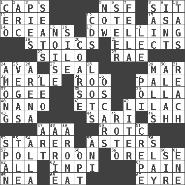 ACROSS 1. Balmoral and tarboosh 5. Science/research agcy. 8. Be seated 11. One of the Great Lakes 12. ____ d'Azur (French Riviera) 13. White ___ sheet 14. Seas 17. Residence 19. Unemotional ones 21. Opts 22. Grain storage tower 23. Actress Charlotte 24. Actress Gardner 27. Lick closed 29. Spoil 32. Haggard of country music 34. Friend of Pooh 36. Light colored 37. Double curve, resembling the letter S 38. Distress signal 39. Spanish pot 40. Billionth: prefix 41. And so on (abbr.) 42. Pale purple color 43. Girls' org. (abbr.) 44. Indian skirt 46. Quiet! 47. American Automobile Association (abbr.) 50. College mil. group 52. A viewer who gazes fixedly 55. Michaelmas daisies 57. Coward 59. Threatening words 62. Everything 63. Body of Kaffir warriors 64. Ache 65. Teachers' org. 66. Ingest 67. Jane of fiction DOWN 1. Corporate head (abbr.) 2. Curve 3. Sliced desserts 4. Theater features 5. Immediately 6. Navigate 7. Man or boy (slang) 8. Ketch in the Levant 9. Is not 10. Labels 12. Music discs 15. Annoying sound 16. Filth; sediment 18. Area sheltered from the wind 20. Unrefined 24. Amid 25. Viva Las _ 26. Sports stadium 28. Plunders 29. Promenades 30. Assad's deity 31. Arrive at 33. Lion 35. Motion picture awards 36. Luau course 42. 61 cubic inches 45. Printing process, for short 47. Tate display 48. Nest on high 49. Odor 51. Streamer paper 52. Connect, as a bridge 53. Lacquered or enameled metalware 54. Silent film actress Nazimova 55. Cuckoo 56. Kill 58. Choose 60. Title for a knight 61. Compass dir.