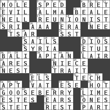ACROSS 1. Undercover agent 5. Hurried 9. Cy Young winner Saberhagen 13. Morally bad or wrong 14. _ mater 15. Calif. Air Force Base 16. 1994 drama film starring Jodie Foster 17. One who advocates reunion 19. _ Lanka 20. Auto club (abbr.) 21. Epoch 22. Born 23. Russian ruler of old 25. Fast jet (abbr.) 26. Moves on water 30. "Vaya con ____" 34. Damascus' land 35. Needle holder 36. Indonesian resort city 39. Bee-related 42. Den 43. Ancient Greek god of war 44. Sibling's daughter 46. Egg locale 47. Distinguishing feature 48. Raised railways 51. Georgia ____ (Atlanta school) 54. Fitting 57. Large container 58. Compass dir. 60. Being at a high temperature 62. Sour, prickly fruit 65. Citrus frut 66. _____ Park, CO 67. Hearing organs 68. Singles 69. Proofreading order 70. Relief 71. Piece DOWN 1. Not women's 2. Unconcealed 3. Ms. Damita and namesakes 4. Pipe bend 5. "Two Mules for Sister ____" 6. Entreaty 7. Australian flightless bird 8. Natives or inhabitants of Denmark 9. Benjamin's nick name 10. Water falling in drops from the sky 11. Otherwise 12. False hair 15. Water vessel 18. Big collection agency 20. Like ___ of sunshine 24. Help 27. Retirement account (abbr.) 28. Mouth edge 29. Virtuous person 30. Keyboard key 31. Call ___ day 32. Fr. "Yes" 33. Title for a knight 36. Forbid 37. "We ___ not amused" (Victoria) 38. French article 40. Atmosphere 41. Teachers' org. 45. Quote 48. Nights before holidays 49. Experiment locale 50. Navigate 52. Large country 53. Homing pigeon 54. Matures 55. Mail 56. Carry 58. Blunders 59. System (abbr.) 61. Trial 63. Arrange properly for use 64. Actress Charlotte 65. Chop off