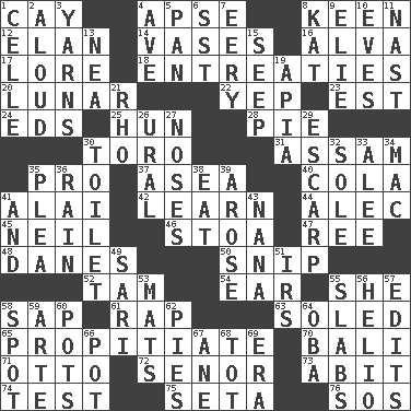ACROSS 1. Island 4. Domed church section 8. Peachy ____! 12. Style 14. Flower holders 16. Inventor's middle name 17. Old wives' tales, e.g. 18. Pleas 20. Type of eclipse 22. Slangy assent 23. Eastern Standard Time (abbr.) 24. Begley and Asner 25. Attila the _ 28. Sliced dessert 30. "Corrida" creature 31. Indian state 35. Adept person 37. Toward the sea 40. Root beer relative 41. Mountain range southwest of Kyrgyzstan 42. Memorize 44. Actor Baldwin 45. Famous astronaut Armstrong 46. Portico 47. To separate or throw off 48. Natives or inhabitants of Denmark 50. Clip 52. Scottish cap 54. Hearing organ 55. A female animal or person 58. Plant excrement 61. Hit sharply and swiftly 63. Having a sole or soles 65. Appease 70. Indonesian resort city 71. Von Bismarck 72. Sir (Sp.) 73. "This won't hurt ____!" 74. Trial 75. Bristle 76. Distress signal DOWN 1. Cell (Danish) 2. Verbally 3. Tall tales 4. "___ Maria" 5. Baking dish 6. Fast jet (abbr.) 7. Suggestive of the supernatural 8. Krazy ___ of comics 9. Writer Wiesel 10. Nights before holidays 11. Political cartoonist Thomas 13. Teachers' org. 15. Ooze 19. Capital of Western Samoa 21. 17th letter of the Greek alphabet 26. Mountain range 27. Olfactory organs 29. Fortification 30. Bathroom 32. Flatfish 33. Toward shelter 34. Big _ 35. Entreaty 36. Precipitation 38. Ingest 39. Came up 41. Plus 43. Nanny 49. Indian skirt 51. Big collection agency 53. Floor coverings 55. Thick slices 56. Sun: prefix 57. Proofreads 58. Specific locale 59. Johnson of "Laugh-In" 60. Plant holders 62. Sliced desserts 64. Chief or king in Benin or Nigeria 66. Plant holder 67. One (Scot) 68. Small child 69. Epoch