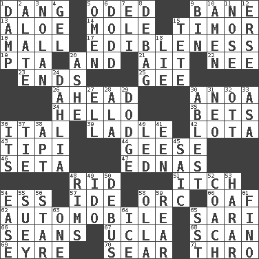 ACROSS 1. Mild oath, euphamism for damn 5. Wrote a lyric poem 9. Object of repulsion 13. Medicinal plant 14. Undercover agent 15. The easternmost of the Lesser Sundas 16. Shopping center 17. The property of being fit to eat 19. Parent Teacher Assoc. 20. Added to 21. Small island 22. Born 23. Conclusions 25. Turn to the right 26. At or in the front 30. Small Philippine buffalo 34. Phone greeting 35. Stakes 36. Slanted text style (abbr.) 39. Dipping utensil 42. Globular water bottle used in Asia 43. Native american tent (variation) 44. Honkers 46. Bristle 47. Ferber et al. 48. To free from 51. Hankering 54. Double-curved letter 57. Binary compound 58. The grampus (Milton) 60. Clumsy lout 62. Form of transportation 65. Indian skirt 66. Actors Connery and Penn 67. Southern CA. univ. 68. Examine minutely or intensely 69. Jane of fiction 70. Shrivel 71. Through, poetically DOWN 1. Moist 2. Having winglike extensions 3. Pitcher Ryan 4. Set 5. Sign of something about to happen 6. Texas town _ City 7. Biblical high priest 8. Debunk (Brit. slang) 9. Storage container 10. So be it 11. Olfactory organ 12. Celtic language 15. Wig 18. Falsehood 20. American tennis player Robert 24. Mexican or Central American flower 27. Pipe bend 28. Chicken ___ king 29. Evade 30. Most capable 31. Modern: prefix 32. Baseball player Mel 33. White ___ sheet 36. It is 37. Neckwear 38. Fitting 40. Directed 41. Car or cant ending 45. Ketch in the Levant 48. Basketball hoops 49. Wedding promise 50. Alight from a bus 52. Team commander 53. Ethiopian city, capital of Harari 54. Comfort 55. Chop _ 56. Play the lead 58. Water jar 59. Tail end 61. A pale, very dry sherry 63. Single 64. Frozen water 65. Fast jet (abbr.)