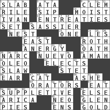 ACROSS 1. Broad, flat, thick piece 5. _ moment's notice (2 wds.) 8. Clement's nick name 12. Cause heat under the collar 13. Small drink 14. Wet 15. _ the terrible 16. Pleas 19. Arrange properly for use 20. More disrespectful 21. A home for chicks 23. Single 24. French article 27. 90 degrees 30. Writer of Portnoy's Complaint (1969) 31. Disorder of the immune system 34. Pledge 35. Drug cop 38. New (sp.) 40. Housemaid 41. Butter sub 42. Chooses 44. Cole _ (cabbage dish) 45. Proofreading order 46. Hearing organ 47. Feline 50. American tennis player Robert 53. Speakers 57. Ingest 59. Supplementary 63. Otherwise 64. N. Chile seaport 65. Modern: prefix 66. Small, secluded valley 67. Sliced desserts 68. Followers of ems 69. Precious metal DOWN 1. Indian titles of respect 2. Make or become more lively 3. Having winglike extensions 4. Benjamin's nick name 5. Toward the sea 6. Metal containers 7. Flats, for short 8. Small bed 9. Cards in a Roman deck? 10. Compass dir. 11. Mountains (abbr.) 14. Female horse 17. _ de Janeiro 18. Car or cant ending 20. Comedian Laurel of Laurel & Hardy 22. Manatee 24. Rich soil 25. Singer James 26. Quiet! 28. Elected rep. 29. Loyal 30. Exposes to great heat 32. Set 33. Jacques Cousteau's middle name 35. Olfactory organ 36. Silent film actress Nazimova 37. Tail end 39. Sep. follower 43. Afternoon social gatherings 47. Root beer relative 48. "We ___ not amused" (Victoria) 49. Make lace 51. Phone greeting 52. Artist's stand 54. Prong on a fork 55. Baking chamber 56. Vintage cars 58. Watch over 59. Plant excrement 60. RI univ. 61. Sliced dessert 62. Personal Computers (abbr.) 63. Oval reproductive body of a fowl