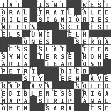 ACROSS 1. Make lace 4. Is not 8. 270 degrees 12. Relating to the mouth 14. Hang back 16. Toward shelter 17. Cause heat under the collar 18. Seigniories (variant) 20. Confronts 22. _-fi 23. Eastern Standard Time (abbr.) 24. Raised railways 25. University (slang) 28. Shade tree 30. Singles 31. Father Junipero _ 35. Curvy letter 37. Narrow board 40. Adolescent 41. Synchronize (abbr.) 42. Laconic 44. Residence 45. Roberta Peters solo 46. Pull apart 47. Bear (Spanish) 48. _ dish (used to culture cells) 50. Passed on 52. Filthy place 54. Car or cant ending 55. "___ Maria" 58. Reproach for some lapse or misdeed 61. Actress Gardner 63. Having a sole or soles 65. The property of being fit to eat 70. Port city in Latvia 71. California wine valley 72. Remove all contents or possession from 73. Of or related to the anus 74. Sign of things to come 75. "Two Mules for Sister ____" 76. Compass dir. DOWN 1. Singer Mel 2. Satellite of Uranus 3. Lies 4. ___ a Wonderful Life 5. Indian title of respect (Mr.) 6. Tired old horse 7. Canisters 8. Armed conflict 9. Writer Wiesel 10. Observes 11. Trial 13. Allow 15. Louse (plural) 19. Lubricates 21. Player for Phoenix 26. Egg locale 27. Small island 29. Mode 30. Motion picture awards 32. Vintage cars 33. San ____ (Riviera town) 34. One (Scot) 35. Jane of fiction 36. In a ____ (agitated or irritated) 38. "We ___ not amused" (Victoria) 39. Sadhe (variant) 41. Plant excrement 43. One of the Great Lakes 49. Slanted text style (abbr.) 51. Followers of ems 53. Jacques Cousteau's middle name 55. Place in a line 56. Viva Las _ 57. Peak District village in England 58. Former U.S. Attorney General Janet 59. First of billions? 60. Corncob 62. Pismires 64. Mouth or opening 66. Prohibit 67. Epoch 68. Title for a knight 69. Health resort