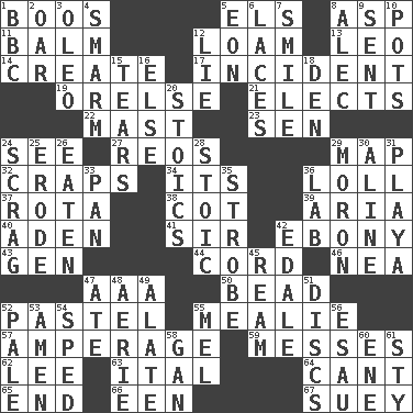 ACROSS 1. Expressions of contempt or scorn 5. Raised railways 8. Viper 11. Lip ointment 12. Rich soil 13. Lion 14. Make 17. Event 19. Threatening words 21. Opts 22. Vertical spar for supporting sails 23. Elected rep. 24. Perceive with the eye 27. Vintage cars 29. Atlas unit 32. Dice game 34. It is 36. Hang loosely or laxly 37. Round or rotation of duties 38. Small bed 39. Operatic vocal solo 40. An important port of Yemen 41. Title for a knight 42. Black 43. Commissioned military rank (abbr.) 44. Drawstring 46. Teachers' org. 47. American Automobile Association (abbr.) 50. Necklace unit 52. Soft color 55. Ear of corn 57. Electrical Measurement 59. Makes clutter 62. Area sheltered from the wind 63. Slanted text style (abbr.) 64. Patter 65. Conclusion 66. Car or cant ending 67. Chop _ DOWN 1. English channel? 2. Boat paddle 3. Butter sub 4. Excessive but superficial compliments 5. A really long time 6. Shoestrings 7. Grin 8. Actor Baldwin 9. Transmitted 10. Cooking vessels 12. Falsehood 15. Pulls into pieces 16. Otherwise 18. Lair 20. Unemotional ones 24. Strangle with an iron collar 25. Wear away 26. Consumed 28. Unemotional 29. Person of subnormal intelligence 30. Place in a line 31. Beach, in Buenos Aires 33. Baking dish 35. Disco prop 36. Experiment locale 42. Peak District village in England 45. 480, 500 or 516 sheets of paper 47. Had dinner 48. Nest on high 49. Having winglike extensions 51. Flat circles 52. Light colored 53. So be it 54. Drove too fast 55. Cartoonist voice _ Blanc 56. He sold his birthright 58. Separate the seeds from cotton 60. Compass dir. 61. Filthy place