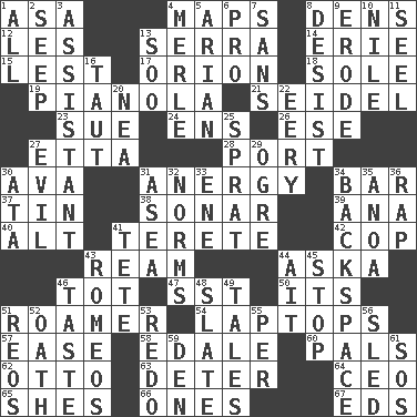 ACROSS 1. White ___ sheet 4. Atlas contents 8. Habitations of wild animals 12. French article 13. Spanish missionary in California 14. One of the Great Lakes 15. For fear that 17. Constellation of myth 18. Flatfish 19. Player piano 21. Beer mug 23. Take to court 24. Followers of ems 26. Compass dir. 27. Singer James 28. Sweet dark-red dessert wine 30. Actress Gardner 31. Disorder of the immune system 34. Tavern 37. Metal container 38. Underwater navigation system 39. Santa ___, CA 40. The first octave above the treble staff 41. Cylindrical with tapered ends 42. Police officer (slang) 43. 480, 500 or 516 sheets of paper 44. "____ silly question..." 46. Small child 47. Fast jet (abbr.) 50. ___ a Wonderful Life 51. Nomad 54. Portable computers 57. Relaxation 58. Peak District village in England 60. Friends 62. "Beetle Bailey" pooch 63. Prevent from occurring 64. Corporate head (abbr.) 65. "______ My Girl" (Turtles hit) 66. Washington bills 67. Begley and Asner DOWN 1. 100% 2. Ooze 3. Helper 4. Haggard of country music 5. Believer in; advocate of (suffix) 6. Adept person 7. Without 8. Stop 9. Wear away 10. Mediterranean tributary 11. Stitch closed the eyes of (a falcon) 13. "Barney Miller" actor Jack 16. Pulled tight 20. Teachers' org. 22. Suggestive of the supernatural 25. Small fatty European fish 27. Morally bad or wrong 29. Legendary monster 30. "One Day ___ Time" 31. Toward the sea 32. Typical models 33. Compass dir. 34. Keyboard key 35. Small Philippine buffalo 36. Reproach for some lapse or misdeed 41. Wig 43. Lover boys 44. Small island 45. Obstruct or block passage 46. Clothes sense 48. Chalkboard 49. Lies 51. Vintage cars 52. Pledge 53. Do over again 55. For each 56. Downhill vehicle 59. Lair 61. Mayday
