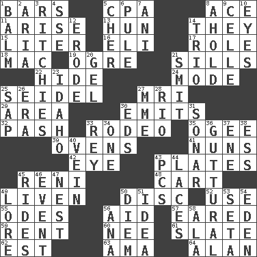 ACROSS 1. Soap units 5. Numbers guy (abbr.) 8. Adept person 11. Originate 13. Attila the _ 14. Those things 15. 61 cubic inches 16. Biblical high priest 17. Hero or heavy, e.g. 18. Apple computer (short form) 19. Legendary monster 21. Beverly of Met fame 22. Flintstone garb 24. Method 25. Beer mug 27. Medical imaging device (abbr.) 29. Type of rug 30. Gives off 32. Romantic infatuation 33. Cowboy competition 35. Double curve, resembling the letter S 39. Baking chambers 41. Religious women 42. Sight organ 43. Food holders 45. Painter Guido (1575-1642) 48. Haul 49. Make or become more lively 50. Compact _ 52. Purpose 55. Lyric poems 56. Assist 57. Having ears or earlike features 59. Monthly bill 60. Born 61. Chalkboard 62. Eastern Standard Time (abbr.) 63. Nursemaid (var.) 64. Actor Alda or Thicke DOWN 1. Lip ointment 2. Roberta Peters solo 3. Actors Guy, Robert Welles, and Clint 4. Compass dir. 5. "Mermaids" star 6. Whimper 7. Black tropical American cuckoo 8. Hold, grip (Informal) 9. Cell (Danish) 10. Sight organs 12. Eat (away) 14. Musical group of three 20. Set 21. Stricken, poetically 23. Potato state 25. Plant excrement 26. Epoch 27. Madame (abbr.) 28. River (Sp.) 30. Begley and Asner 31. Echolocation 33. Marina Del _, California 34. Single 36. From the throat 37. Compass dir. 38. Curvy letter 40. Distinctive style or manner 43. Personal Computers (abbr.) 44. Shoestrings 45. Amusement-park features 46. Happening 47. A home for chicks 49. Old wives' tales, e.g. 50. South Vietnam president (1954) 51. The main thing one is thinking about 53. Stalk of a moss capsule 54. Paradise 56. Santa ___, CA 58. Chicken ___ king