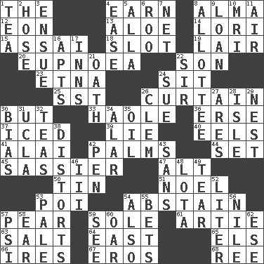ACROSS 1. Definite Article 4. Merit 8. _ mater 12. Period of immesurable duration 13. _ vera 14. Australian parrot (variant) 15. Slender Brazilian palm 18. Narrow opening 19. Den 20. Normal relaxed breathing 22. Manchild 23. Inactive volcano in Sicily 24. Be seated 25. Fast jet (abbr.) 26. Window treatment 30. On the contrary 33. White Person, in Hawaii 36. Celtic language 37. On the rocks 39. Untruth 40. Snakelike fish 41. Jai ____ 42. Insides of hands 44. Arrange properly for use 45. More impudent 47. Keyboard modifier key 50. Metal container 51. Christmas carol 53. Luau course 54. Choose not to consume 57. Lightbulb-shaped fruit 59. Flatfish 61. Nick name for Arthur 63. Table seasoning 64. Compass direction 65. Raised railways 66. Angers 67. Greek god of love 68. Portuguese money of account (variant) DOWN 1. Afternoon social gathering 2. Stockings 3. Follow as a consequence or result 4. Relaxation 5. Silent film actress Nazimova 6. Friend of Pooh 7. Fish or hair follower 8. One to whom something is allotted 9. Grant temporary use of 10. Medical imaging device (abbr.) 11. Wind 16. Flats, for short 17. Taverns 21. Pledge 22. Title for a knight 24. Institute legal proceedings 26. Clement's nick name 27. Ancient Greek god of war 28. Capri or Wight 29. Egg locale 30. Prejudice 31. Southern CA. univ. 32. Beverages made from leaves 34. Having or resembling wings 35. Lubricate 38. What propaganda does 42. Writing instrument 43. Without 46. One more than two 48. Globular water bottle used in Asia 49. Separate forcefully 52. 61 cubic inches 53. Diluted with white 54. In addition 55. Wagers 56. The longest river in the world 57. Air pressure measure (abbr.) 58. Ewer handle 59. Observe 60. Rowing implement 62. Compass dir.