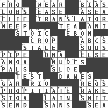 ACROSS 1. Away 4. Put on (as clothing) 8. Prejudice 12. Tennis shots 14. Relaxation 15. At sea 16. Writer Wiesel 17. Interpreter 20. Shed a tear 21. Beverage made from leaves 22. Black tropical American cuckoo 23. Unemotional 27. Inky black, to poets 29. Riding implement 31. Lettered men learn these first 34. Showing deterioration from age 35. Beer foam 36. Corncob 39. Heredity factor (abbr.) 41. Otherwise 42. Small Philippine buffalo 43. Unadorned figures 46. Friends 47. _ gin 48. Trial 51. Natives or inhabitants of Denmark 54. Slender fish 56. _ de Janeiro 58. Vintage cars 61. Appease 66. Libertine 67. Portico 68. (Had) reclined 69. In a ____ (agitated or irritated) 70. Post 71. Without 72. Ocean DOWN 1. Soared 2. Hero or heavy, e.g. 3. Off-Broadway awards 4. Dripping 5. Hearing organ 6. White ___ sheet 7. Monthly bill 8. Sound made by sheep 9. Byzantium, centuries later 10. A really long time 11. Indian skirt 13. Back-to-school mo. 18. Observe 19. Experiment locale 24. Sep. follower 25. Lyricist Gershwin 26. Lacking warmth 28. Fertile tracts in a desert 30. Actor Sean's family 32. Music discs 33. Compass dir. 34. Gospel singer Marvin 36. Infant food 37. _ tizzy (2 wds.) 38. Characterized by complete cowardliness 40. Old (Scot.) 44. ___ good deed 45. Car or cant ending 49. _ Lanka 50. Teat (slang) 52. Blunders 53. Actors Connery and Penn 54. Global Positioning Systems (abbr.) 55. Johnson of "Laugh-In" 57. Lubricates 59. Migrant worker of the '30s 60. Bristle 62. Groovy apt. 63. Auto club (abbr.) 64. Metal container 65. Followers of ems