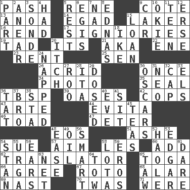 ACROSS 1. Romantic infatuation 5. French philosopher Descartes 9. ____ d'Azur (French Riviera) 13. Small Philippine buffalo 14. Mild oath 15. Member of a famous L.A. basketball team 16. Tear apart 17. Seigniories (variant) 19. Small amount or degree 20. It is 21. Alias (abbr.) 22. Compass dir. 23. Monthly bill 25. Elected rep. 26. Bitter 30. At one time in the past 34. Picture 35. Lick closed 36. Cook's measure (abbr.) 39. Fertile tracts in a desert 42. 911 reaches them 43. Johnson of "Laugh-In" 44. Webber/Rice musical 46. Frog relative 47. Prevent from occurring 48. Greek goddess of the dawn 51. American tennis player Robert 54. Institute legal proceedings 57. Direct toward a target or goal 58. French article 60. Say or write further 62. Interpreter 65. Ancient Roman robe 66. Match 67. Printing process, for short 68. Having or resembling wings 69. Political cartoonist Thomas 70. It was, poetically 71. We are DOWN 1. Component 2. Approach 3. Message 4. Possessed 5. Take ten 6. The front part of a cuirass 7. Tired old horse 8. Ferber et al. 9. Auto 10. Migrant worker of the '30s 11. Adolescent 12. Celtic language 15. Grant temporary use of 18. Mamie's mate 20. Hankering 24. Slept 27. Friend of Pooh 28. Call ___ day 29. Administered medicine 30. Motion picture awards 31. Modern: prefix 32. Head covering 33. Raised railways 36. Make lace 37. Sis' sibling 38. R.R. building 40. First lady 41. Be seated 45. Afternoon social gatherings 48. Comfort 49. Petroleum 50. Don Adams' spy role 52. White Person, in Hawaii 53. _ Allan Poe 54. Comedian Laurel of Laurel & Hardy 55. Capital and largest city of Mongolia 56. Hearing organs 58. Globular water bottle used in Asia 59. Greek god of love 61. Have the gumption 63. Remaining after all deductions 64. Pull behind 65. The 23rd letter of the Hebrew alphabet