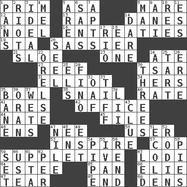 ACROSS 1. Demure 5. White ___ sheet 8. Female horse 12. Assistant 13. Hit sharply and swiftly 14. Natives or inhabitants of Denmark 15. Christmas carol 16. Pleas 19. R.R. building 20. More disrespectful 21. A type of plum 23. Single 24. Had dinner 27. Coral ridge 30. Russian ruler of old 31. American author Paul (1891-1958) 34. Possessive pronoun 35. Soup holder 38. Slow-paced one 40. Pace 41. Ancient Greek god of war 42. Position of authority 44. Nathan's nickname 45. Do some clerical work 46. Followers of ems 47. Born 50. One who uses or employs something 53. Heighten or intensify 57. Police officer (slang) 59. Supplementary 63. Farming town in central California 64. First name in cosmetics 65. Baking dish 66. Writer Wiesel 67. Rend 68. Conclusion 69. Lairs DOWN 1. Zero-star reviews 2. Debaucheries 3. Standard of perfection 4. Cartoonist voice _ Blanc 5. Length times width 6. Without 7. Flats, for short 8. Floor protector 9. Cuckoo 10. To riddle 11. Double-curved letter 14. Have the gumption 17. River (Sp.) 18. Car or cant ending 20. Sew up the eyelids of hawks and falcons 22. Threatening words 24. At sea 25. Small pie 26. Celtic language 28. Raised railways 29. A pale, very dry sherry 30. Trios 32. Clumsy lout 33. Small quarrel 35. Object of repulsion 36. Northwest Algerian city 37. Soaks 39. Cards in a Roman deck? 43. A slight indication 47. Mediterranean tributary 48. Compass dir. 49. Eastern Standard Time (abbr.) 51. Learning spot: Fr. 52. "The Thinker" sculptor 54. Corncob 55. _ the terrible 56. Tear apart 58. Sliced desserts 59. Put into a specified state 60. Purpose 61. Parent Teacher Assoc. 62. For each 63. Directed