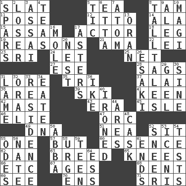 ACROSS 1. Narrow board 5. Beverage made from leaves 8. Scottish cap 11. Introduce or present, as a question 12. "Tell ____ the Marines!" 14. Chicken ___ king 15. Indian state 17. Thespian 18. Part of a journey 19. Thinks logically 21. Housemaid (var.) 22. Flowery wreath 23. _ Lanka 24. Allow 25. Fish or hair follower 27. Compass dir. 28. Droops 31. Old wives' tales, e.g. 35. Three (prefix) 37. Mountain range southwest of Kyrgyzstan 38. Length times width 39. What Jean-Claude Killy likes to do 41. Peachy ____! 42. Vertical spar for supporting sails 43. Epoch 45. Small island 46. Writer Wiesel 47. The grampus (Milton) 49. Heredity factor (abbr.) 51. Teachers' org. 52. Be seated 55. Single 57. With the exception that 60. Core 62. One of the 12 tribes of Israel 63. A special lineage 65. Leg joints 66. And so on (abbr.) 67. Ripens 68. Undesirable depression on a surface 69. Perceive with the eye 70. Followers of ems 71. Indian titles of respect DOWN 1. Practice fights 2. Failure 3. Slender Brazilian palm 4. Afternoon social gatherings 5. Nervous spasm 6. Singer James 7. Smallest unit of an element 8. Baron Munchausen's specialties 9. Toward shelter 10. Wise men 13. NW Algerian seaport 16. Undercover agent 17. Michaelmas daisies 20. Egg locale 26. 1973 Nobel Price Winner (Physics) Leo 29. Highlander 30. Trig term 31. Unable to walk 32. Taken by mouth 33. Home 34. Consumed 36. Mamie's mate 40. Pressed 44. Ancient Greek god of war 48. Keg 50. Swedish rock group 52. Scornful expression 53. Ancient Celtic tribe of eastern Britain 54. Trials 55. Lyric poems 56. Nathan's nickname 58. Goad 59. Adolescent 61. Conclusions 64. Double-curved letter