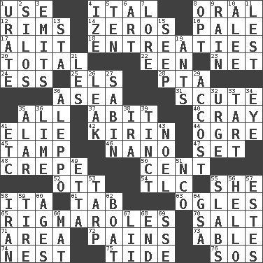 ACROSS 1. Purpose 4. Slanted text style (abbr.) 8. Spoken 12. Basketball hoops 14. Nothings 16. Light colored 17. Came down and settled, as after flight 18. Pleas 20. Add up to 22. Car or cant ending 23. Fish or hair follower 24. Curvy letter 25. Raised railways 28. Parent Teacher Assoc. 30. At sea 31. Snake scale 35. 100% 37. "This won't hurt ____!" 40. Supercomputer manufacturer 41. Writer Wiesel 42. Japanese brewing company 44. Legendary monster 45. Pack (down) 46. Billionth: prefix 47. Arrange properly for use 48. Streamer paper 50. Penny 52. Baseball player Mel 54. Affectionate concern, for short 55. A female animal or person 58. Call ___ day 61. Bar bill 63. Stares at amorously 65. Complicated, petty procedures 70. Table seasoning 71. Length times width 72. Aches 73. Competent 74. A home for chicks 75. Periodic rise and fall of the sea level 76. Mayday DOWN 1. A salt of uric acid 2. Grain storage towers 3. Sends forth 4. Ending with capital 5. "___ Little Indians" 6. Tate display 7. Old wives' tales, e.g. 8. Choose 9. Precipitation 10. Toward shelter 11. For fear that 13. R.R. building 15. Ooze 19. Pismires 21. French article 26. Path through which fluid escapes 27. Unit of acoustic absorption 29. Buttonhole 30. City in Syria 32. Goad 33. Small pie 34. Sight organ 35. Having or resembling wings 36. Citrus frut 38. Retirement account (abbr.) 39. A color or tint 41. And so on (abbr.) 43. Christmas carol 49. Singer James 51. Non-commissioned officer (abbr.) 53. Canvas cover 55. Thick slices 56. Phone greeting 57. _____ Park, CO 58. SW Asia republic 59. Become fatigued 60. Eras 62. Water vessel 64. Girls' org. (abbr.) 66. Floor covering 67. Cards in a Roman deck? 68. Conclusion 69. Compass dir.