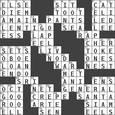 ACROSS 1. Otherwise 5. Be seated 8. Feline 11. South Vietnam president (1954) 12. A blast of a horn 14. Biblical high priest 15. With great haste 17. Leg coverings 18. Directed 19. Small, flat, pigmented spot on the skin 21. Ocean 22. Area sheltered from the wind 23. Double-curved letter 24. Pet locale 25. Reproach for some lapse or misdeed 27. Snakelike fish 28. "Mermaids" star 31. Arranges properly for use 35. 54 in ancient Rome 37. Puff or smoke 38. Mitch Miller's instrument 39. Allow head to fall sleepily 41. Singles 42. Grant temporary use of 43. Armed conflict 45. Egg locale 46. Inside; within (prefix) 47. Was introduced to 49. Indian title of respect (Mr.) 51. Black tropical American cuckoo 52. Followers of ems 55. Sep. follower 57. Remaining after all deductions 60. Commissioned military rank 62. Thick or sticky substance 63. Streamer paper 65. Before Barbara or Clara 66. Friend of Pooh 67. Johnson of "Laugh-In" 68. Thailand, formerly 69. Pipe bend 70. Elected rep. 71. Snakelike fish DOWN 1. Peak District village in England 2. Citrus fruits 3. Actors Connery and Penn 4. Give off 5. R.R. building 6. Charged atoms 7. Haul 8. Portable communications device 9. Toward shelter 10. Periodic rise and fall of the sea level 13. Russian ruler of old 16. "Death on the ____" 17. Cotton for raincoats, e.g. 20. Highlander 26. Gambison 29. Makes supply last 30. State of inaction 31. Flatfish 32. Inky black, to poets 33. Inedible or poisonous agaric 34. Sir (Sp.) 36. Solemn pledge 40. Break 44. French philosopher Descartes 48. Metal containers 50. South American Indian 52. Bert's buddy 53. Brizilian seaport 54. Hits or strikes with great force 55. Legendary monster 56. Calm and collected 58. Blunders 59. Wig 61. Relaxation 64. Fenced enclosure