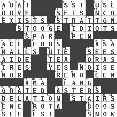 ACROSS 1. Blind as ____ 5. Fast jet (abbr.) 8. Purpose 11. Be footloose 12. Arranges properly for use 13. Non-commissioned officer (abbr.) 14. Is 17. Ski resort town in Vermont 19. Moe Howard, for one 21. Foolish or stupid persons 22. Practice fight 23. Animal enclosure 24. Adept person 27. Greek god of love 29. White ___ sheet 32. Shopping centers 34. Shoshoni 36. Perceives with the eye 37. Assistant 38. Afternoon social gathering 39. Mouths or openings 40. Angers 41. It is so 42. Annoying sound 43. Not either 44. San ____ (Riviera town) 46. Car or cant ending 47. Housemaid (var.) 50. Long (Scottish) 52. Spoke pompously 55. Michaelmas daisies 57. Conveyance 59. Flight of steps 62. Compass dir. 63. Round or rotation of duties 64. Expressions of contempt or scorn 65. Observe 66. Eastern Standard Time (abbr.) 67. Frozen precipitation DOWN 1. "We ___ not amused" (Victoria) 2. Gift holder 3. Advice 4. Trials 5. Put into a specified state 6. Long narrow piece of something 7. Sadhe (variant) 8. To (old English) 9. Highlander 10. Immeasurably long periods of time 12. Compass dir. 15. Drinks excessively 16. Fly high 18. Metal container 20. Cross 24. With great haste 25. Capital of Egypt 26. A person who is older than you are 28. Guide 29. Nest on high 30. Gospel singer Marvin 31. NE Netherlands city 33. French article 35. Artist's stands 36. "Barney Miller" actor Jack 42. Music written for nine 45. Floor protectors 47. "One Day ___ Time" 48. Distance measurement (Brit.) 49. Goodbye (Sp.) 51. Catches 52. Lyric poems 53. French philosopher Descartes 54. Toward shelter 55. Santa ___, CA 56. The Jewish people; Israel 58. Baseball player Mel 60. Friend of Pooh 61. Compass dir.