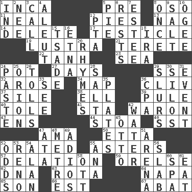 ACROSS 1. South American Indian 5. Before (prefix) 8. Bear (Spanish) 11. Actress Patricia 12. Sliced desserts 13. Tired old horse 14. Keyboard key 17. One of the two male reproductive glands 19. A period of five years 21. Cigar-shaped 22. Hyperbolic tangent 23. Ocean 24. Plant holder 27. 24-hour periods 29. Compass dir. 32. Came up 34. Atlas unit 36. 154 in Roman numerals 37. Drop; flow; fall 38. Pipe bend 39. Whimper 40. Lacquered or enameled metalware 41. R.R. building 42. Make _____ (do battle with) 43. Followers of ems 44. Portico 46. Fast jet (abbr.) 47. Wet nurse (var.) 50. Singer James 52. Declaimed 55. Michaelmas daisies 57. Conveyance 59. Threatening words 62. Heredity factor (abbr.) 63. Roll call or roster of names 64. California wine valley 65. Boy, to dad 66. Eastern Standard Time (abbr.) 67. Blind as ____ DOWN 1. Indiana (abbr.) 2. Born 3. Give a ring to 4. Native American of Southwest Alaska 5. Sliced dessert 6. Musical pauses 7. First name in cosmetics 8. At one time in the past 9. Table seasoning 10. Double curve, resembling the letter S 12. Parent Teacher Assoc. 15. Sadhe (variant) 16. Inactive volcano in Sicily 18. Lyricist Gershwin 20. Poems 24. Thick mixture 25. Greek mythologigal hunter 26. For Whom the Bell _____ 28. Table seasonings 29. Runs notes together 30. Grain storage towers 31. Happening 33. Observe 35. Food holders 36. Tax preparer (abbr.) 42. Wetness 45. Von Bismarck 47. _ moment's notice (2 wds.) 48. Distance measurement (Brit.) 49. Goodbye (Sp.) 51. Sports stadium 52. Probability 53. Western Nevada city 54. Actor Alda or Thicke 55. Santa ___, CA 56. Broad, flat, thick piece 58. Baseball player Mel 60. Health resort 61. Ingest