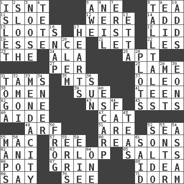 ACROSS 1. Is not 5. A saturated hydrocarbon 8. Afternoon social gathering 11. A type of plum 12. Past tense of be (plural) 14. Say or write further 15. Plunders 17. Robbery 18. Hat (slang) 19. Substance 21. Allow 22. French article 23. Definite Article 24. In the manner of 25. Fitting 27. For each 28. Unable to walk 31. Scottish caps 35. Mountains (abbr.) 37. Margarine 38. Sign of something about to happen 39. Institute legal proceedings 41. Adolescent 42. Went 43. Overdraft (abbr.) 45. Fast planes 46. Helper 47. Domesticated feline 49. Sandy's bark 51. "We ___ not amused" (Victoria) 52. Ocean 55. Apple computer (short form) 57. Portuguese money of account (variant) 60. Thinks logically 62. Black tropical American cuckoo 63. Lowest deck of a ship 65. Table seasonings 66. Plant holder 67. Smile widely 68. The content of cognition 69. Declare 70. Observe 71. Dormintory (informal) DOWN 1. Small island 2. Splash clumsily 3. Trap for birds or small mammals 4. False hair 5. Deep reverence 6. Famous astronaut Armstrong 7. Celtic language 8. Baron Munchausen's specialties 9. Singer Brickell 10. Sums up 13. Singer James 16. Fastener 17. Centers 20. Clement's nick name 26. Graphs 29. Confront 30. Immeasurably long periods of time 31. Ancient Roman robe 32. Mine, in Marseilles 33. Ananias' fault 34. Contemptuous expression 36. Player for Phoenix 40. Fortification 44. Conductor's collection 48. Beverages made from leaves 50. Tree-dwelling hopper 52. Twentieth part of a lira 53. Keyboard key 54. Indian state 55. Atlas contents 56. Small Philippine buffalo 58. Blunders 59. Writer Wiesel 61. Alleged 64. Single