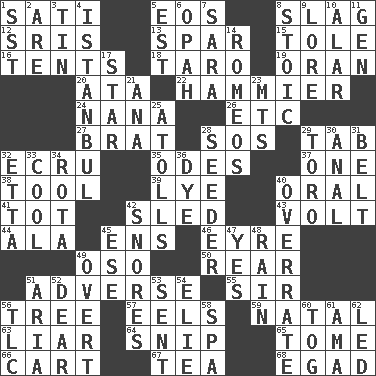 ACROSS 1. Suttee (variant) 5. Greek goddess of the dawn 8. Volcanic refuse 12. Indian titles of respect 13. Coast Guard woman 15. Lacquered or enameled metalware 16. Portable shelters 18. Pacific island yam 19. Northwest Algerian city 20. "One Day ___ Time" 22. More given to overacting 24. Grandmother 26. And so on (abbr.) 27. Naughty child 28. Mayday 29. Bar bill 32. Shade of tan 35. Lyric poems 37. Single 38. Utensil 39. Potassium hydroxide 40. Spoken 41. Small child 42. Downhill vehicle 43. Electrical Unit 44. Insect wing 45. Followers of ems 46. Jane of fiction 49. Bear (Spanish) 50. Stern 51. Contrary to your interests or welfare 55. Title for a knight 56. Woody plant 57. Snakelike fish 59. Relating to or accompanying birth 63. One who doesn't tell the truth 64. Clip 65. Heavy book 66. Heavy open wagon 67. Afternoon social gathering 68. Mild oath DOWN 1. Fast jet (abbr.) 2. "We ___ not amused" (Victoria) 3. Metal container 4. Byzantium, centuries later 5. Eastern Standard Time (abbr.) 6. Brightly colored fish 7. "Two Mules for Sister ____" 8. Unemotional 9. Old wives' tales, e.g. 10. Having or resembling wings 11. Commissioned military rank (abbr.) 14. Lover boys 17. Play the lead 21. Santa ___, CA 23. Mountains (abbr.) 25. Ringlike coral islands and reefs 28. Sowing specialist 29. "Corrida" creature 30. Of or related to the anus 31. Waist strap 32. Singer James 33. Calm and collected 34. Round or rotation of duties 36. Color 40. Make much ado about nothing 42. Sounds asleep 45. Compass dir. 47. Consenting reply 48. Precipitation 49. Unconcealed 51. Operatic vocal solo 52. Letter starter 53. Emitted 54. Writer Wiesel 56. Affectionate concern, for short 58. Health resort 60. Coat; cloak 61. Housemaid (var.) 62. Directed