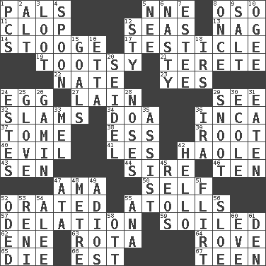 ACROSS 1. Friends 5. Compass dir. 8. Bear (Spanish) 11. Hoof sound 12. Oceans 13. Tired old horse 14. Moe Howard, for one 17. A testis 19. Tootsie (variant) 21. Cigar-shaped 22. Nathan's nickname 23. Affirmative reply 24. Oval reproductive body of a fowl 27. (Had) reclined 29. Perceive with the eye 32. Criticizes harshly 34. ___ good deed 36. South American Indian 37. Heavy book 38. Double-curved letter 39. Carrot, for example 40. Morally bad or wrong 41. French article 42. White Person, in Hawaii 43. Elected rep. 44. The founder of a family 46. "___ Little Indians" 47. Wet nurse (var.) 50. Oneself 52. Declaimed 55. Ringlike coral islands and reefs 57. Conveyance 59. Dirtied 62. Compass dir. 63. Round or rotation of duties 64. Be footloose 65. Pass on 66. Eastern Standard Time (abbr.) 67. Adolescent DOWN 1. Personal Computers (abbr.) 2. The first octave above the treble staff 3. Spoils 4. Soup utensil 5. Born 6. Offensive 7. First name in cosmetics 8. At one time in the past 9. Table seasoning 10. Double curve, resembling the letter S 12. Filthy place 15. Purposes of endeavors 16. Singer James 18. Big collection agency 20. Beer mug 24. _____ Park, CO 25. Michael Jackson trademark 26. Homeless child 28. Olfactory organs 29. Snob 30. Learning spot: Fr. 31. Consumed 33. Cartoonist voice _ Blanc 35. Help 36. Retirement account (abbr.) 42. Phone greeting 45. Vintage cars 47. _ moment's notice (2 wds.) 48. Distance measurement (Brit.) 49. Goodbye (Sp.) 51. Seductive woman who exploits men 52. Wrote a lyric poem 53. Painter Guido (1575-1642) 54. Toward shelter 55. Santa ___, CA 56. A type of plum 58. Baseball player Mel 60. Night before a holiday 61. Lair