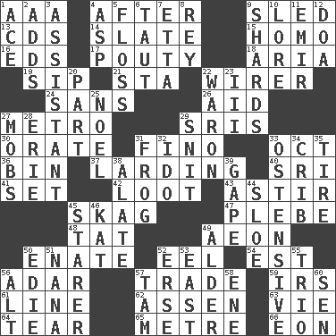 ACROSS 1. Auto club (abbr.) 4. Following 9. Downhill vehicle 13. Music discs 14. Chalkboard 15. Like (prefix) 16. Begley and Asner 17. Marked by pouting 18. Roberta Peters solo 19. Small drink 21. R.R. building 22. One who wires 24. Without 26. Help 27. Paris' subway 29. Indian titles of respect 30. Speak pompously 31. Fine (Spanish) 33. Sep. follower 36. Storage container 37. Preparing or cooking with lard 40. _ Lanka 41. Put into a specified state 42. Spoils 43. Moving about 45. Heroin 47. Military trainee 48. Make lace 49. Period of immesurable duration 50. Maternal 52. Snakelike fish 54. Eastern Standard Time (abbr.) 56. The sixth month of the Jewish calendar 57. Barter 59. Big collection agency 61. Actor's bit 62. NE Netherlands city 63. Compete 64. Separate forcefully 65. Distance measurement (Brit.) 66. A really long time DOWN 1. Adept person 2. Sums up 3. Helper 4. Viper 5. Soft thread for cleaning between teeth 6. Strained 7. Singer James 8. Marina Del _, California 9. Broken pieces 10. Old wives' tales, e.g. 11. Arab leader 12. ___ good deed 20. Piece 22. Make _____ (do battle with) 23. One more than two 25. Christmas carol 27. Crowds into 28. 4th largest of the Great Lakes 29. In a ____ (agitated or irritated) 31. Toadlike animal 32. Wedding promise 33. Clearly or manifestly demonstrative 34. Baby bed with high sides 35. Become fatigued 38. Having winglike extensions 39. Stare wonderingly 44. _ gin 45. A viewer who gazes fixedly 46. Krazy ___ of comics 49. Tree or shrub in the Birch family 50. Singer Brickell 51. Grandmother 52. Celtic language 53. Compass direction 55. Musical group of three 56. The first octave above the treble staff 57. Scottish cap 58. Compass dir. 60. Elected rep.