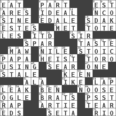 ACROSS 1. Erode 4. Piece 8. Eastern Standard Time (abbr.) 11. Ancient Greek god of war 13. Perfect 15. Non-commissioned officer (abbr.) 16. Trig term 17. Peak District village in England 18. Neighbor of Neb. 19. _____ Park, CO 21. Was introduced to 22. Haul 23. French article 24. It would 27. Title for a knight 29. Coast Guard woman 30. Clothes sense 34. Informal term for the mouth 36. Mediterranean tributary 39. Unemotional 40. Dad 41. Robbery 43. "Corrida" creature 44. Exploiting 46. Burn superficially 47. Single 48. Lacking originality or spontaneity 49. Peachy ____! 51. In the manner of 53. D.D.E's nickname 54. Infant locale 57. Path through which fluid escapes 60. Benjamin's nick name 63. Trap for birds or small mammals 65. Stare 66. Naughty children 69. Inconspicuous attention getter 70. Strike 71. Nick name for Arthur 72. Pull into pieces 73. Begley and Asner 74. Bristle 75. _ de Janeiro DOWN 1. Artist's stand 2. Get up 3. Portable shelters 4. Sliced dessert 5. Find the sum of 6. 480, 500 or 516 sheets of paper 7. Lie 8. Inside; within (prefix) 9. Jazz singing style 10. Puff or smoke 12. Perceive with the eye 14. Allows 18. Ski resort town in Vermont 20. Small drink 25. Hyperbolic tangent 26. Frees from moisture 28. ___ a Wonderful Life 29. Tchaikovsky ballet 31. Within a short period 32. Become fatigued 33. Environmental prefix 34. Vertical spar for supporting sails 35. Capital of Western Samoa 37. Whopper 38. 1973 Nobel Price Winner (Physics) Leo 40. Product of festering 42. Long journey 45. Set 50. Car or cant ending 52. Swedish rock group 54. Failure 55. Slender Brazilian palm 56. Stone: prefix 57. Old wives' tales, e.g. 58. Mild oath 59. High mountains 61. Blunders 62. Nathan's nickname 64. Elect 67. Teat (slang) 68. Ocean
