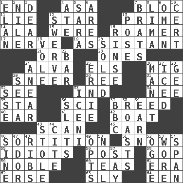 ACROSS 1. Conclusion 4. White ___ sheet 7. Coalition 11. Falsehood 12. Play the lead 13. A-one 14. Insect wing 15. We are 16. Wanderer 17. Effrontery 19. Aide 21. Globe 23. Singles 24. Inventor's middle name 25. Raised railways 26. Russian fighter aircraft 29. Scornful expression 30. Portuguese money of account (variant) 31. Adept person 32. Perceive with the eye 33. Working for oneself (abbr.) 34. Born 35. R.R. building 36. _-fi 37. A special lineage 40. Hearing organ 41. Area sheltered from the wind 42. Water vessel 43. Examine hastily 45. Automobile 46. Conclusion 51. Overwhelms 55. Foolish or stupid persons 56. Mail 58. Republican Party 59. Having high moral qualities 60. Beverages made from leaves 61. Period 62. Celtic language 63. Insidious 64. Car or cant ending DOWN 1. Liveliness 2. Mediterranean tributary 3. Letter starter 4. Had dinner 5. "Two Mules for Sister ____" 6. Ancient Greek god of war 7. Naughty children 8. Pale green bean 9. Sign of things to come 10. An absolute certainty 12. Turn aside suddenly 13. Airs 16. Wash lightly 18. Grand slam 20. Having a sole or soles 22. Long, evenly shaped piece 24. Approach 25. Bert's buddy 26. French painter Edouard 27. On the rocks 28. Unit of force equal to gravity 29. Stalk of a moss capsule 32. Compass dir. 33. Ancient Celtic tribe of eastern Britain 36. Narrow boards 37. English channel? 38. Ridicules or criticizes harshly 39. Merit 43. Fur scarf 44. Quote 46. Trig term 47. Scent 48. Chest bones 49. Elects 50. Christmas carol 52. Double curve, resembling the letter S 53. Had on 54. Connect, as a bridge 57. Declare