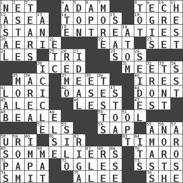 ACROSS 1. Fish or hair follower 4. First man 8. Technical 12. Toward the sea 14. Traditional theme or motif 16. Legendary monster 17. Comedian Laurel of Laurel & Hardy 18. Pleas 20. Nest on high 22. Erode 23. Arrange properly for use 24. French article 25. Three (prefix) 28. Mayday 30. On the rocks 31. Confronts 35. Big _ 37. Rendezvous 40. Angers 41. Australian parrot (variant) 42. Fertile tracts in a desert 44. Do not 45. Actor Baldwin 46. For fear that 47. Eastern Standard Time (abbr.) 48. Calif. Air Force Base 50. Implement 52. Raised railways 54. Plant excrement 55. Santa ___, CA 58. RI univ. 61. Title for a knight 63. The easternmost of the Lesser Sundas 65. Wine waiters 70. Pacific island yam 71. Dad 72. Stares at amorously 73. Fast planes 74. Stricken, poetically 75. Toward shelter 76. A female animal or person DOWN 1. Relating to the nose 2. First name in cosmetics 3. Rends 4. Had dinner 5. Spanish title 6. Fitting 7. Greater amount 8. Small child 9. The front part of a cuirass 10. Algonquian 11. Command 13. Cuckoo 15. Oceans 19. Smallest unit of an element 21. And so on (abbr.) 26. San ____ (Riviera town) 27. Perfect 29. Beer mug 30. Hanging ice 32. Greek god of love 33. Portable shelter 34. Fast jet (abbr.) 35. Undercover agent 36. Type of rug 38. Compass dir. 39. Trials 41. Experiment locale 43. Portico 49. Otherwise 51. Elect 53. Grain storage tower 55. Collect or gather 56. 0 degrees 57. Came up 58. United States Postal Service (abbr.) 59. Wander 60. Body of Kaffir warriors 62. Capital of Latvia 64. ___ a Wonderful Life 66. Floor protector 67. Pipe bend 68. To separate or throw off 69. Compass dir.