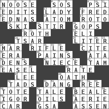 ACROSS 1. Trap for birds or small mammals 6. Mayday 9. Air pressure measure (abbr.) 12. Proofreads 13. Kenny Rogers chart-topper in '80 14. Flintstone 15. Ferber et al. 16. Smallest unit of an element 17. Printing process, for short 18. What Jean-Claude Killy likes to do 19. Commotion 20. Republicans 21. Writer of Portnoy's Complaint (1969) 23. Biblical high priest 24. Russian ruler of old 25. 61 cubic inches 28. Spoil 30. Firearm 34. Quote 35. Epoch 36. Aches 38. "One Day ___ Time" 39. Cub Scout units 41. Sibling's daughter 43. Scottish cap 44. Artist's stand 46. Assign a rank or rating to 48. Area sheltered from the wind 49. Pledge 50. Small amounts or degrees 51. Mild oath, euphamism for damn 53. To sift 56. Carry 57. Lie 58. Memphis, Tenn. Street 60. Russian composer Stravinsky 61. Lubricates 62. Nest on high 63. 4-wheeled motor vehicle 64. Girls' org. (abbr.) 65. NE Netherlands city DOWN 1. Born 2. Likelihood 3. Pig sound 4. Flight of steps 5. Curvy letter 6. Suttee (variant) 7. Scent 8. Symbol (abbr.) 9. Conciliate 10. Arranges properly for use 11. Wedding promise 13. Thin strip of wood or metal 14. Play 19. Remove all contents or possession from 20. Set 22. Rowing implement 24. Interpreter 26. Singer James 27. 480, 500 or 516 sheets of paper 28. Ancient Persian 29. Type of rug 31. Avid follower 32. Cards in a Roman deck? 33. Compass dir. 37. Strangle with an iron collar 40. Sowing specialist 42. Erode 45. French article 47. Threesomes 49. Washington bills 50. Ancient Roman robe 51. Raised platform 52. Silent film actress Nazimova 54. Hearing organs 55. Writer Wiesel 56. Nervous spasm 57. Coat; cloak 58. Sound made by sheep 59. Car or cant ending