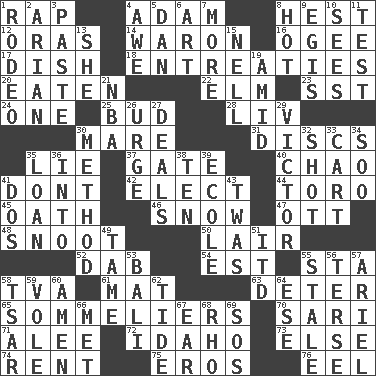 ACROSS 1. Hit sharply and swiftly 4. First of billions? 8. Behest 12. Mouths or openings 14. Make _____ (do battle with) 16. Double curve, resembling the letter S 17. Food container 18. Pleas 20. Ingested 22. Shade tree 23. Fast jet (abbr.) 24. Single 25. Partially opened flower 28. 54 in ancient Rome 30. Female horse 31. Flat circles 35. Whopper 37. Yard entry 40. US Secretary of Labor Elaine L. _ 41. Do not 42. Opt 44. "Corrida" creature 45. Pledge 46. Frozen precipitation 47. Baseball player Mel 48. Snout, nose 50. Den 52. Pat or tap gently 54. Eastern Standard Time (abbr.) 55. R.R. building 58. Federal power corp. 61. Floor covering 63. Prevent from occurring 65. Wine waiters 70. Indian skirt 71. Toward shelter 72. Potato state 73. Otherwise 74. Monthly bill 75. Greek god of love 76. Snakelike fish DOWN 1. Cowboy competition 2. Believer in; advocate of (suffix) 3. Thick mixture 4. Deep reverence 5. One of the 12 tribes of Israel 6. Nonscientific branch of learning 7. Greater amount 8. Being at a high temperature 9. Armor plate that protects the chest 10. Perceives with the eye 11. Trial 13. A female animal or person 15. 1994 drama film starring Jodie Foster 19. Among 21. Basketball assoc. 26. Goad 27. Allots cards 29. Winning man's name 30. Mode 32. Opportunity 33. Draw slowly or heavily 34. "Barney Miller" actor Jack 35. Grant temporary use of 36. To the inside or interior of 38. "___ Little Indians" 39. Learning spot: Fr. 41. Two (Sp.) 43. It was, poetically 49. Docile 51. It would 53. Indonesian resort city 55. Lacking originality or spontaneity 56. Laconic 57. Satellite of Uranus 58. Russian ruler of old 59. Short-tailed, large-bodied rat 60. So be it 62. Event that recurs at intervals 64. Compass dir. 66. Was introduced to 67. Hearing organ 68. 17th letter of the Greek alphabet 69. Mayday
