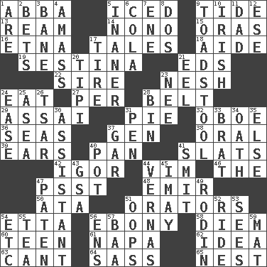 ACROSS 1. Swedish rock group 5. On the rocks 9. Periodic rise and fall of the sea level 13. 480, 500 or 516 sheets of paper 14. Words to Nanette 15. Mouths or openings 16. Inactive volcano in Sicily 17. Lies 18. Assistant 19. French poetic form 21. Begley and Asner 22. Father 23. Soft 24. Erode 27. For each 28. Waist strap 29. Slender Brazilian palm 31. Sliced dessert 32. Mitch Miller's instrument 36. Oceans 37. Commissioned mil. rank 38. Relating to the mouth 39. Hearing organs 40. Baking dish 41. Narrow boards 42. Russian composer Stravinsky 44. Zeal 46. Definite Article 47. Inconspicuous attention getter 48. Arab leader 50. "One Day ___ Time" 51. Speakers 54. Singer James 56. Dark wood 58. South Vietnam president (1954) 60. Adolescent 61. California wine valley 62. The main thing one is thinking about 63. Patter 64. Backtalk 65. A home for chicks DOWN 1. "We ___ not amused" (Victoria) 2. Antes 3. Object of repulsion 4. Collect or gather 5. More empty; more void 6. Root beer relative 7. Compass dir. 8. Two (Sp.) 9. Inedible or poisonous agaric 10. From or relating to Ireland 11. June honoree 12. Compass dir. 17. Hoop that covers a wheel 20. Native american tent (variation) 21. Snakelike fish 23. Born 24. Comfort 25. Toward the sea 26. Russian ruler of old 28. Storage container 30. Aide 31. Fenced enclosure 33. Naughty child 34. Pledge 35. Otherwise 37. Slender fish 40. Cooking vessel 41. Stricken, poetically 43. Girls' org. (abbr.) 44. Actresses Bloom and Felton 45. "If ____ say so..." 47. Eucharist need 49. "The Thinker" sculptor 51. I made a mistake 52. Travel on or in a vehicle 53. Perceives with the eye 54. And so on (abbr.) 55. Afternoon social gathering 56. Followers of ems 57. Sound made by sheep 59. Floor protector