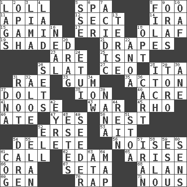 ACROSS 1. Hang loosely or laxly 5. Health resort 8. Egg _ yung 11. Capital of Western Samoa 12. Religious group 14. Retirement account (abbr.) 15. Homeless child 17. One of the Great Lakes 18. Norwegian king 19. Cast a shadow over 21. Window treatments 23. "We ___ not amused" (Victoria) 25. Is not 26. Narrow board 27. Corporate head (abbr.) 28. Call ___ day 31. Actress Charlotte 33. Chewing product 35. NE Massachussets city 37. Stupid person 38. Electrically charged atom 40. 1/640 square mile 41. Trap for birds or small mammals 43. Armed conflict 45. 17th letter of the Greek alphabet 46. Had dinner 47. It is so 50. A home for chicks 52. Celtic language 53. Small island 54. Keyboard key 56. Annoying sounds 61. Give a ring to 62. Dutch treat 65. Get up 66. Mouth or opening 67. Stalk of a moss capsule 68. Actor Alda or Thicke 69. Commissioned mil. rank 70. Strike 71. Common sense DOWN 1. Falls behind 2. Brightly colored fish 3. Pale green bean 4. Put down 5. Compass dir. 6. For each 7. Being or containing an acid 8. Do some clerical work 9. Mouths or openings 10. Clumsy lout 13. Laconic 16. Actress Patricia 18. Elect 20. To draw with force 22. Small Philippine buffalo 24. Needle case 26. Puts into a specified state 28. Hankering 29. "Corrida" creature 30. One (Scot) 31. Carrot, for example 32. Medicinal plant 34. Cut the grass 36. Heavy open wagon 37. Heredity factor (abbr.) 39. Grandmother 42. Jane of fiction 44. It's straight from the horse's mouth 48. _____ Park, CO 49. Sowing specialist 51. Portico 52. Pipe bend 54. Have the gumption 55. Flair 57. SW Asia republic 58. Grain storage tower 59. Son of Isaac 60. Elected reps. 61. Gear tooth 63. "One Day ___ Time" 64. Atlas unit