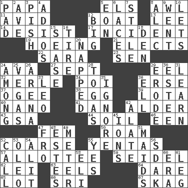 ACROSS 1. Dad 5. Raised railways 8. Leather borer 11. Enthusiastic 12. Water vessel 13. Area sheltered from the wind 14. Cease 17. Happening 19. Weeding 21. Opts 22. "Two Mules for Sister ____" 23. Elected rep. 24. Actress Gardner 27. Back-to-school mo. 29. Snakelike fish 32. Haggard of country music 34. Luau course 36. Celtic language 37. Double curve, resembling the letter S 38. Oval reproductive body of a fowl 39. Globular water bottle used in Asia 40. Billionth: prefix 41. One of the 12 tribes of Israel 42. Tree or shrub in the Birch family 43. Girls' org. (abbr.) 44. Land 46. Car or cant ending 47. Opposite of masc. 50. Wander aimlessly 52. Rough 55. Gossips 57. One to whom something is allotted 59. A glass for beer 62. Flowery wreath 63. Snakelike fish 64. Have the gumption 65. Car dealer's back yard 66. Indian title of respect (Mr.) 67. Heroin DOWN 1. Writing tablet 2. "___ Maria" 3. Expression of disdain 4. Goodbye (Sp.) 5. Period of immesurable duration 6. Shoestrings 7. Vertical member of a panel or frame 8. Actor Baldwin 9. Gone 10. Allows 12. Of large size 15. Gospel singer Marvin 16. Become fatigued 18. Lair 20. Slept 24. Amid 25. Viva Las _ 26. Sports stadium 28. Ancient Roman robes 29. Wear away 30. First name in cosmetics 31. Memorize 33. Lion 35. Disregard 36. Pipe bend 42. Having winglike extensions 45. Charged particles 47. Away 48. _____ Park, CO 49. Distance measurement 51. Unmarried girls 52. Give a ring to 53. Butter sub 54. Set down 55. Affirmative reply 56. Neighbor of Neb. 58. Biblical high priest 60. Period 61. Part of a journey