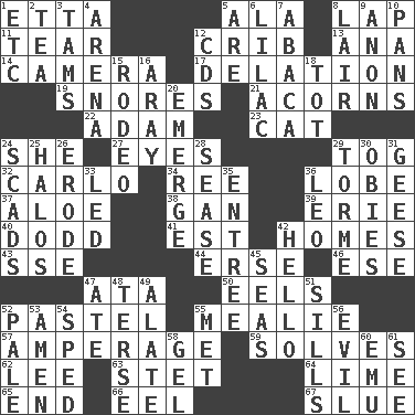 ACROSS 1. Singer James 5. Insect wing 8. Infant locale 11. Pull into pieces 12. Baby bed with high sides 13. Santa ___, CA 14. Device for capturing images 17. Accusation by an informer 19. Sounds asleep 21. Oak nuts 22. First man 23. Feline 24. A female animal or person 27. Snake ____ (dice throw) 29. Coat; cloak 32. Monte _, Las Vegas Hotel/Casino 34. To separate or throw off 36. Ear part 37. Medicinal plant 38. Separate the seeds from cotton 39. One of the Great Lakes 40. Texas town _ City 41. Eastern Standard Time (abbr.) 42. Residences 43. Compass dir. 44. Celtic language 46. Compass dir. 47. "One Day ___ Time" 50. Snakelike fish 52. Soft color 55. Ear of corn 57. Electrical Measurement 59. Finds the solution 62. Area sheltered from the wind 63. Proofreading order 64. Citrus frut 65. Conclude 66. Snakelike fish 67. Change direction abruptly DOWN 1. And so on (abbr.) 2. Beverage made from leaves 3. Scottish caps 4. Sports stadium 5. "We ___ not amused" (Victoria) 6. Pale purple color 7. Phillipine bananalike plant 8. Den 9. At once, immediately (arch.) 10. Baking dishes 12. Music discs 15. Cowboy competition 16. Like ___ of sunshine 18. Small child 20. Develop 24. Heaps 25. Rings 26. Wear away 28. Gospel singer Marvin 29. Singer Mel 30. Off-Broadway awards 31. Honkers 33. Directed 35. Main course 36. Lion 42. Phone greeting 45. Oceans 47. Had dinner 48. Laconic 49. Having winglike extensions 51. Beverly of Met fame 52. Light colored 53. So be it 54. Hurried 55. Was introduced to 56. Tending to cause great harm 58. Set 60. Australian flightless bird 61. Perceive with the eye